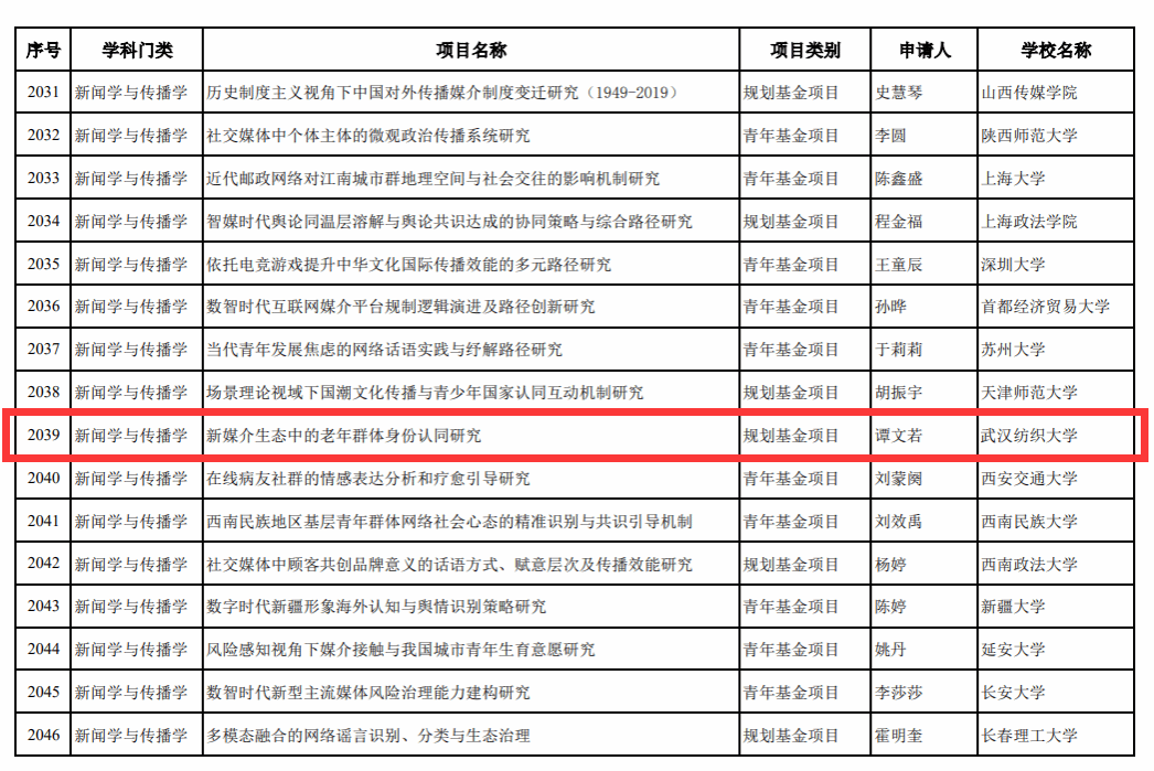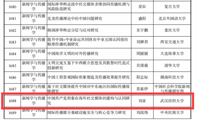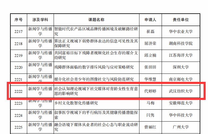 2024年国家社会科学基金年度项目,伟德国际1946bv官网代婷婷副教授《社会认知理论视域下社交媒体对育龄女性生育意愿的影响研究》课题获批一般项目,刘亚博士《中国共产党形象在海外社交媒体的建构与认同研究》课题获批青年项目。
