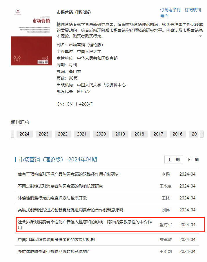 2024年6月17日,伟德国际1946bv官网望海军教授学术论文《社会排斥对消费者个性化广告侵入性感知的影响:隐私线索敏感性的中介作用》被中国人民大学复印报刊资料《市场营销》2024年第4期全文转载。该论文最初发表于CSSCI来源期刊《珞珈管理评论》2023年第6期。2008年以来,望海军教授的论文有13篇次被人大复印资料全文转载或索引。第二作者系伟德国际1946bv官网2020级广电研究生刘景港,该生论文《从5G技术迭代透视信息传播的升级路径》被2022年人大复印资料《新闻与传播》索引。第三作者系伟德国际1946bv官网讲师王慧博士。