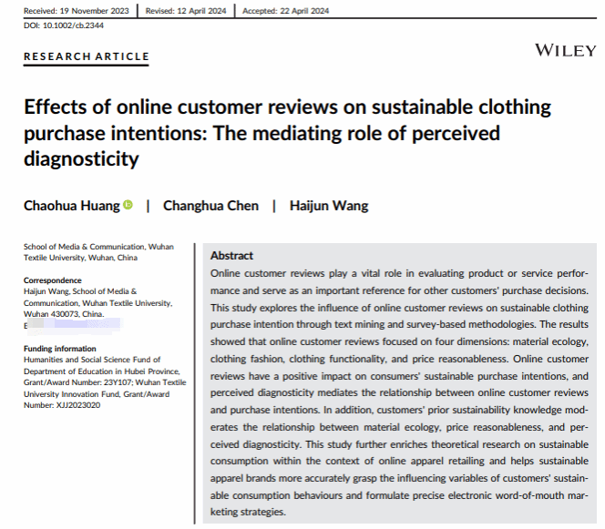 近日,国际知名SSCI来源期刊《Journal of Consumer Behaviour》在线发表了bevictor伟德官网入口传媒学院青年教师黄钞华博士作为第一作者撰写的论文《Effects of online customer reviews on sustainable clothing purchase intentions: The mediating role of perceived diagnosticity》。bevictor伟德官网入口为论文第一单位,bevictor伟德官网入口伟德国际1946bv官网望海军教授为论文通讯作者,2022级硕士研究生陈昌华为该论文第二作者。