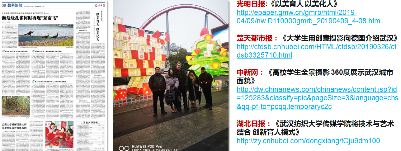 对标全国教育大会、教育部新文科建设工作会议精神,坚持“重品格,牢基础,强实践,能创新”的人才培养特色,建立健全德智体美劳“五育并举”的人才培养体系。充分发挥专业课程的育人功能,将思想政治工作贯穿教育教学全过程,把立德与育人、美育与德育落实到课程教学、实习实践、科学研究、管理服务等各项工作中。摄影专业学生《认识武汉——中德学生同题课程》、数字媒体专业学生《城市数据可视化》、通识教育中心面向全校开设《博雅中国》课程等把摄影艺术、媒介技术、中华文化、思政元素有机结合,起到了很好的效果。在德国汉堡市政厅举办“认识武汉一360度全景摄影同题作品”联展,架起中德文化交流桥梁。光明日报、中新网进行了报到。