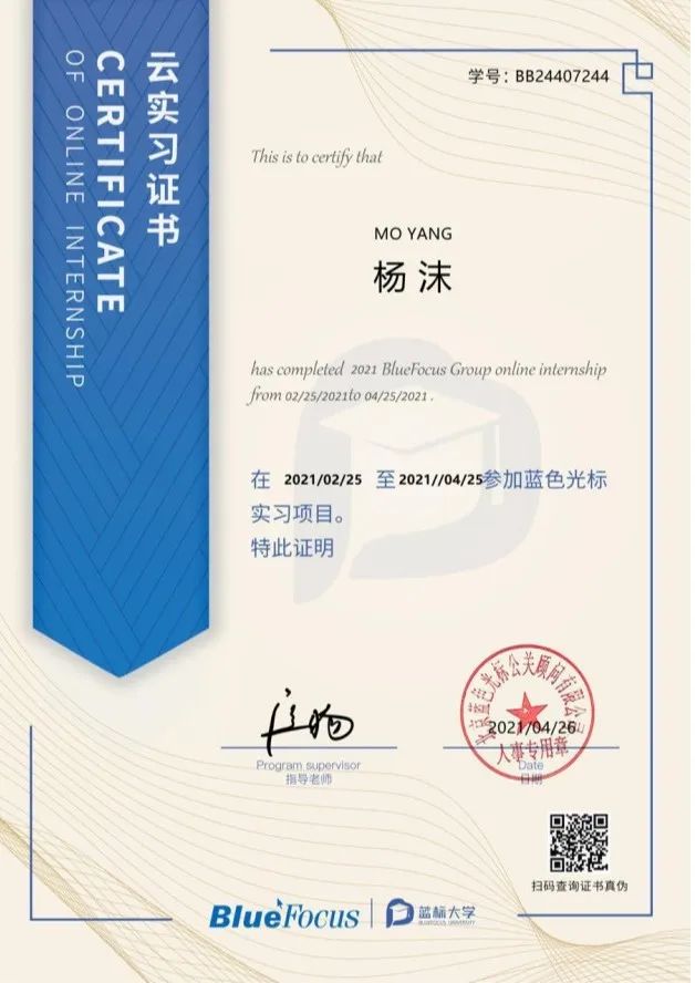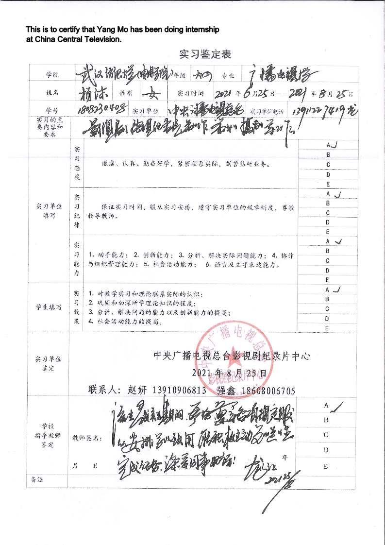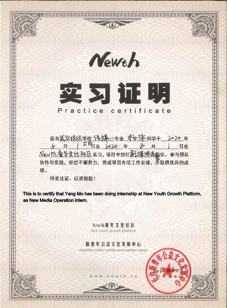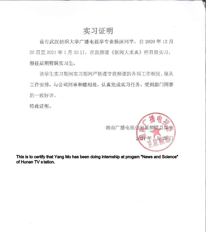 大二暑假在newth青年文化社区实习,负责公众号运营;大三寒假在湖南卫视实习,负责《新闻大求真》栏目的后期剪辑;大四寒假在中央电视台实习,参与到影视栏目制作。