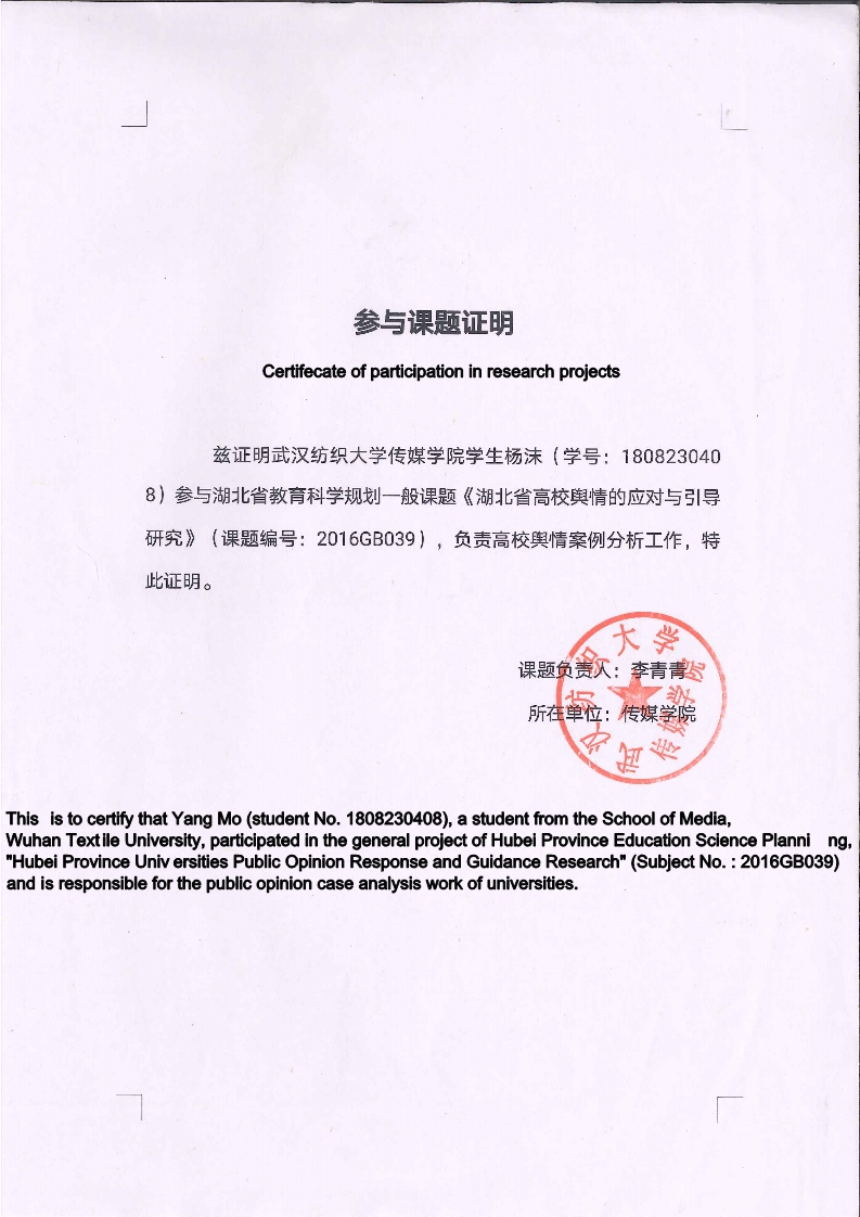 参与到李青青老师的湖北省项目课题研究中;参与了加州大学洛杉矶分校Fransis教授的科研项目中,并以第一作者的身份发表英语论文一篇。