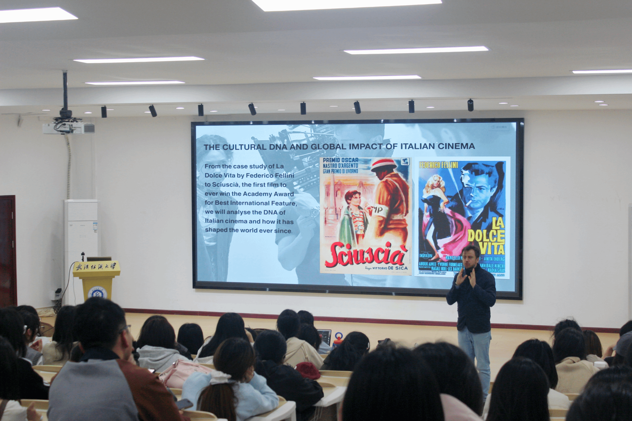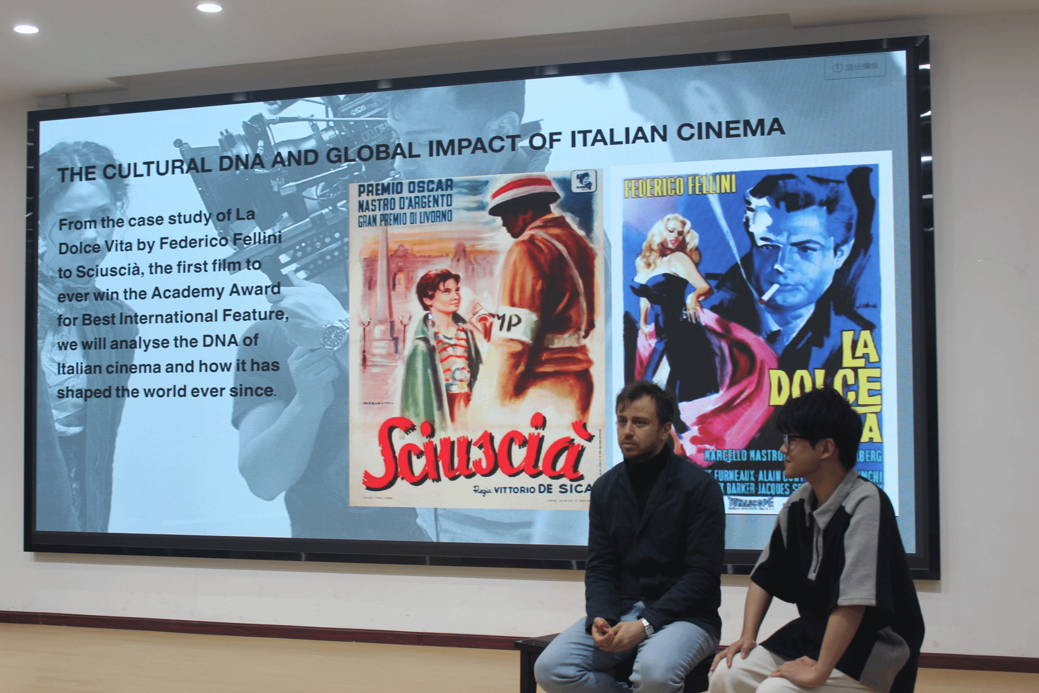 活动中,Cassini教授通过对意大利经典电影赏析,向师生们展示了意大利电影艺术创作风格,同时结合历史背景讲述电影意大利电影发展变革史,并对电影的情感表达和人物刻画进行了重点阐释。他指出,与美国超级英雄电影强调视觉冲击和宏大叙事相比,意大利电影更注重通过细腻的情感联系和内心共鸣打动观众。