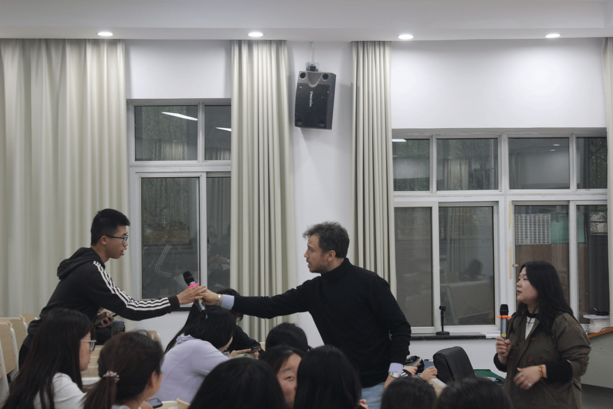 为使学生直观感受到情感连接重要性,Cassini教授现场邀请同学上台进行情景演绎,通过互动表演,使学生们深刻体会了情感共鸣在故事叙事中的重要性。随后,Cassini教授随机邀请现场同学就创作主题进行思考,并给予点评,他表示,“中华文化底蕴深厚,源远流长,为中国艺术创作提供了丰厚滋养,相信大家一定可以创作出具有国际影响力的文化作品。”