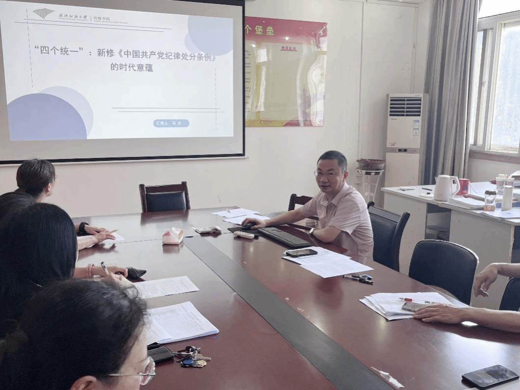 党纪学习教育开展以来,伟德国际1946bv官网各教工党支部切实把思想和行动统一到学校党委决策部署上来,把开展党纪学习教育作为党支部重要政治任务,结合学校、学院工作安排,抓住学习重点、丰富学习形式、联学共建研读党纪,在各党支部开展党纪学习教育,分层分类推动师生党员学纪、知纪、明纪、守纪。