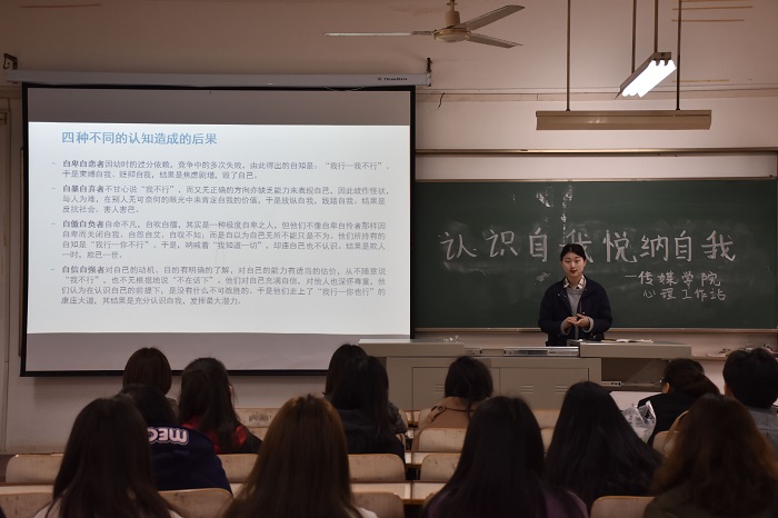 培训开始,张晨用一个谜语将大家引入了今天的主题,然后从三个方面详细的给大家讲解了本次主题。首先她解释了“什么是认识自我,悦纳自我?”,悦纳自我就是能够欣然的接受自己,客观的评价自己,对自己有一个准确的定位,在欣赏自己优点的同时也能够接受自己的缺点和不足。接下来她讲解了“如何认识自我,悦纳自我”,认识自我的方式有很多,我们可以通过他人评价认识自己,可以通过社会实践认识自己,也可以通过反思总结认识自己。经过一个性格测试后张晨还和大家分享了自己如何认识,改变自己的经历。然后她说明了“悦纳自我的重要性”,对自己不同的认知会造成不同的影响:自卑自恋者会压抑自己,束缚自己;自傲自负者会自命不凡,欺骗自己;只有自信自强者才能充分认识自己,发挥自己最大的潜能。良好的自我悦纳可以有效缓解发展中的矛盾冲突,使个体得到健康发展。张晨还通过古希腊政治家,雄辩家狄摩希尼成功的经历告诉了我们悦纳自己可以将不足转化为优势。