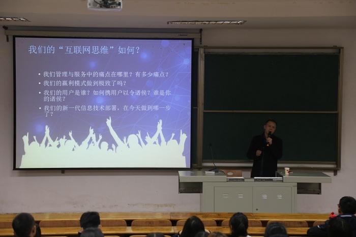首先,李总介绍了“互联网+”的意义。用互联网生态体系的图表告诉同学们什么是“互联网思维”,用"O2O"为引子,讲解平台的意义,阐述创业和就业的速度比以往速度加快;并用例子说明短视频的潜力之大。 接着,李总解释新媒体是什么,指出未来同学们机会的机会就是来自媒体;并讲解了近几年传统媒体的转型;针对伟德国际1946bv官网学生介绍了未来十年有着巨大机会的就业方向;同时分别向同学讲解AI的未来,个性化的方向,传统企业和互联网的结合,内容创业。然后,李总讲解了微信平台和实现创业的方法和有效途径,分析了微信成功的方法。最后,李总介绍了“掌上大学”的项目,介绍了“掌上大学”的发展和前景,向同学们展示掌上大学平台矩阵的规模;并表明自己对掌上大学的信心。强调了视频是一个巨大的风口,希望伟德国际1946bv官网成为bevictor伟德官网入口的一块金字招牌。