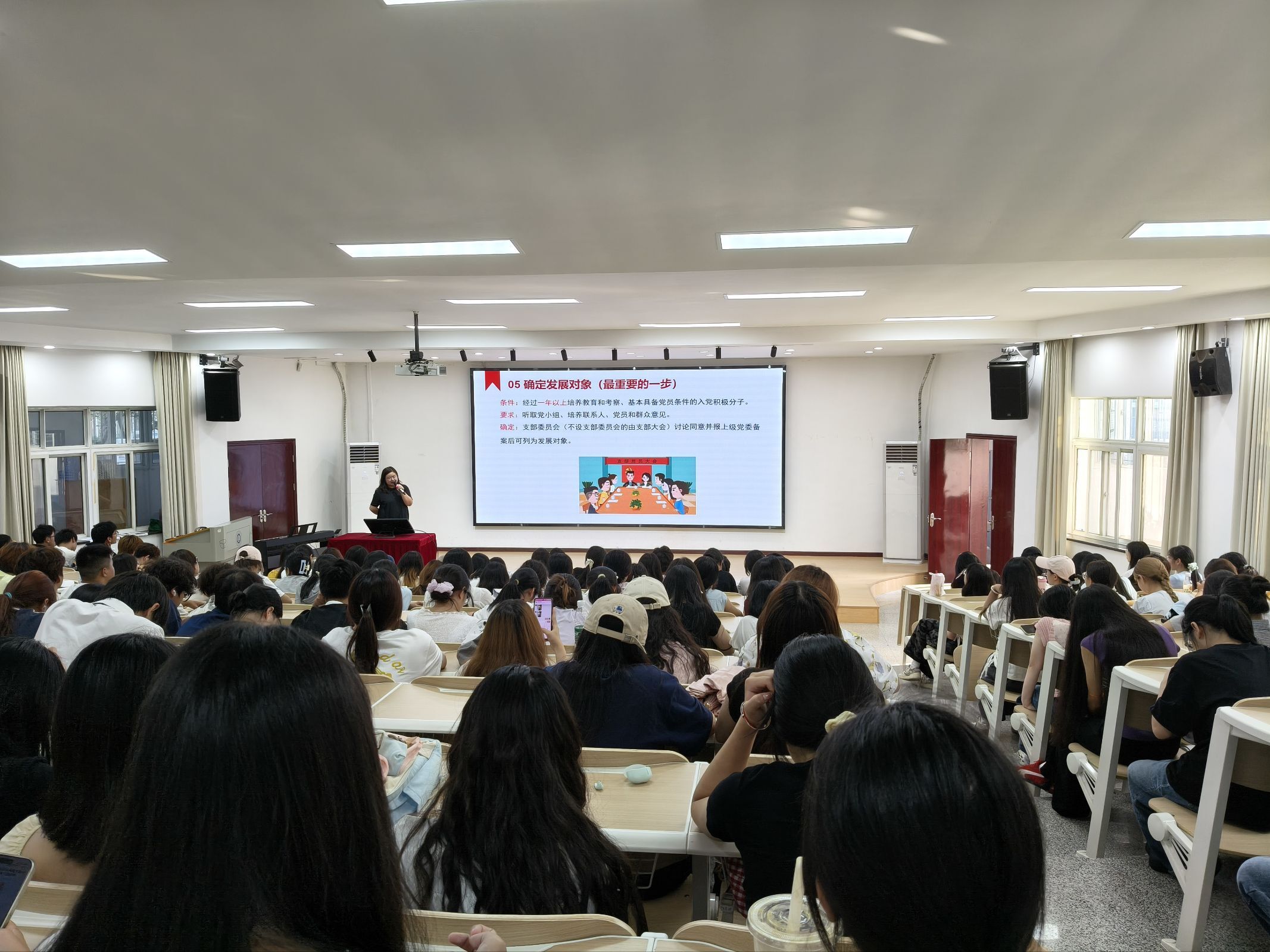 谭安捷以“如何成为一名合格共青团员”为切入点,通过互动问答和榜样故事分享等形式,结合师生先进事迹,生动阐释新时代“合格共青团员”的内涵,强调共青团作为党的助手和后备军的政治属性,帮助同学们深化思想认识,找准发展方向。随后,谭老师系统梳理了从提交入党申请书到成为正式党员的全过程,详细介绍5大程序、25个具体步骤。她强调,入党是政治生命的新起点,每一步都凝结着组织的培养和个人的成长,鼓励同学们脚踏实地、积极进取,以实际行动争取早日加入中国共产党。