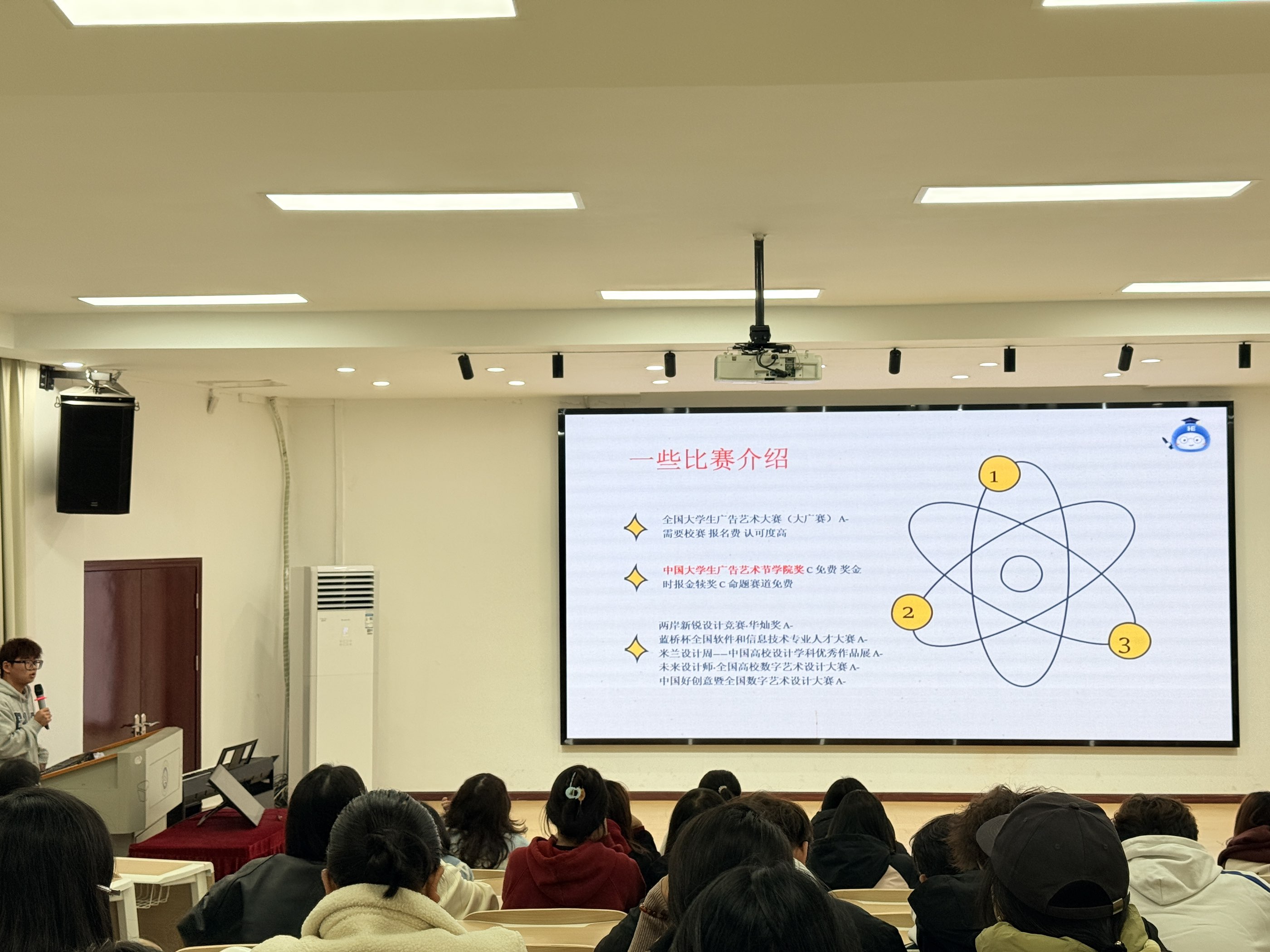 分享中,崔黎结合自身斩获的国家级银奖 1 项、铜奖 3 项及大广赛省级二等奖、优秀奖等获奖经历,系统梳理了新生可参与的专业赛事体系与等级划分,帮助新生建立清晰认知。谈及文案创作核心,他强调“要做生活的有心人,从日常挖掘灵感,善用修辞打造有温度、有力量的文字”。