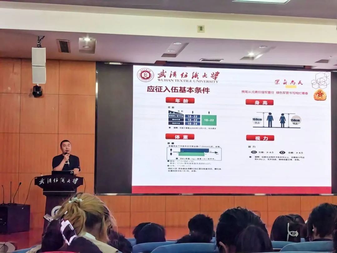 汤老师首先以习近平总书记对广大青年的嘱托开篇,指出大学生参军入伍不仅仅是宪法法律上的义务权利,更是每一个中国青年在民族复兴中应承担的责任。通过例举伟德国际1946bv官网历届学生应征入伍学子风采,鼓励大家磨砺青春、投身国防,让青春之花在祖国需要的地方绽放光彩。