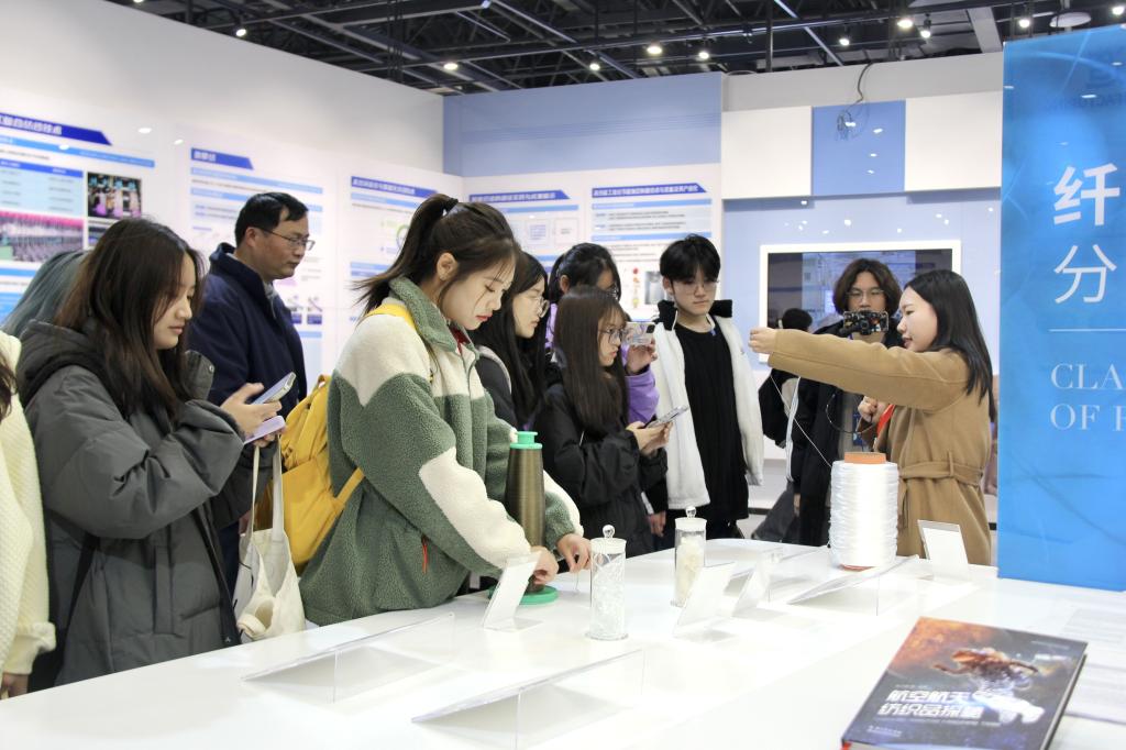 据悉,纺织科技馆共由纺织缘、传统纺织、现代纺织、大纺织、超纺织、未来纺织等六大展厅以及序厅和尾厅共八大部分构成。在讲解员带领下,同学们对湖北纺织史、纺大校史以及优秀校友有了全面认识,对学校发展和纺织行业有了更直接深刻的理解。通过对不同主题展厅的学习,同学们了解到了学校在在纺织领域取得的重大突破和科研成就。例如:织物版五星红旗旗开月面、耐高温密封装置成功助力天问一号火星着陆、“柔洁纺”“多重聚集纺纱”等发明推动行业发展、乙醇与水体系对织物染色方法推动生态保护等等。一项项科研成果、一张张荣誉证书以及一封封感谢信等,使同学们在对纺织行业全面了解的同时,心中更多了一份自豪与感动。