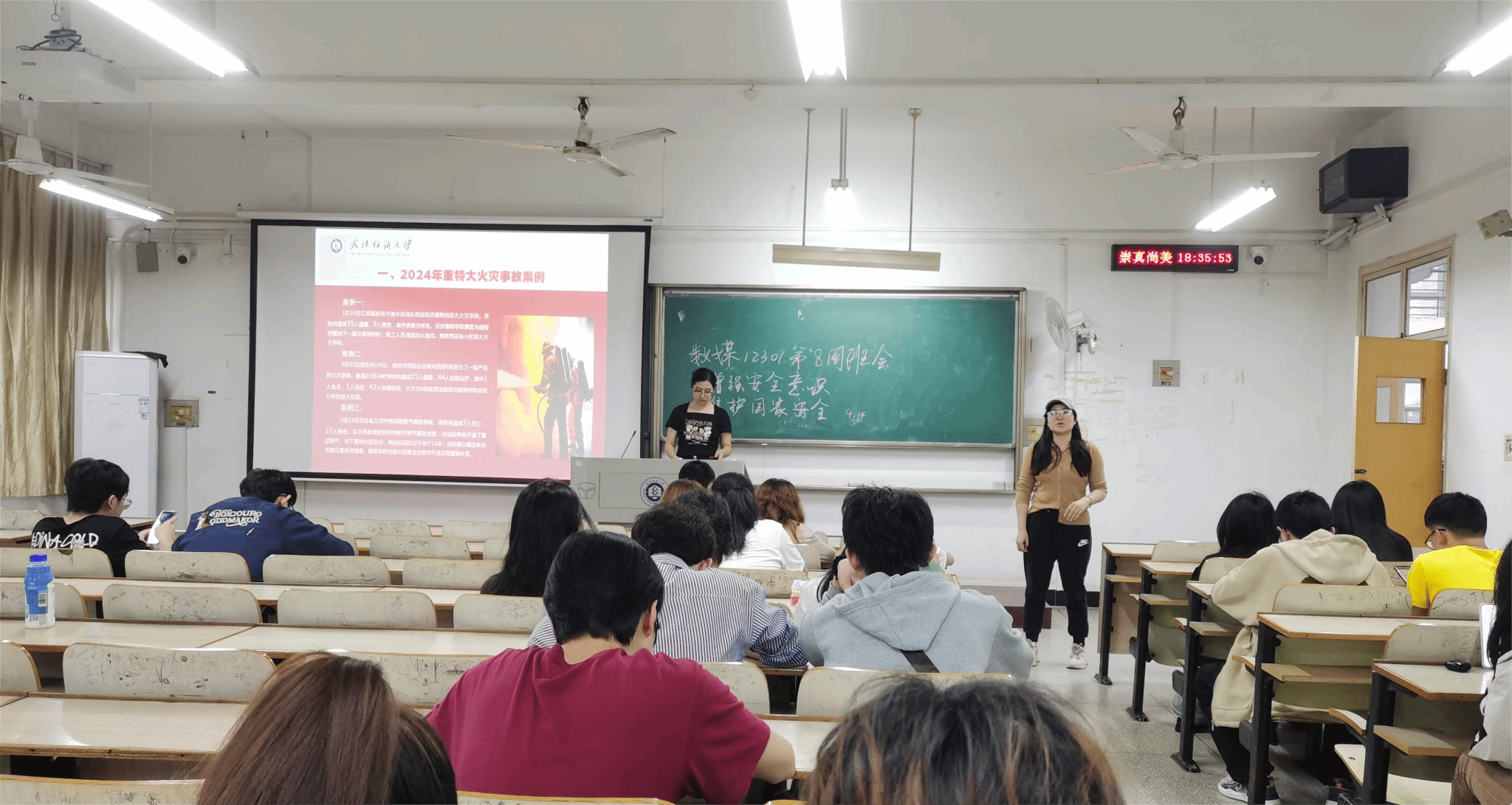 文明在于细节的处理,安全在于未然的防范。老师们首先从本年度重特大火灾事故案例出发,警示同学们火灾带来的不可逆后果,引发学生深思。其次,分析校园火灾的发生原因和事故特点,结合学生的日常生活,针对性地强调了禁止在宿舍使用违规电器、插排及时断电、电动车规范使用等。最后,详细介绍了消防知识“四懂四会”,引导同学们学习消防安全知识和火灾逃生技巧,在生活中做到预防为主,远离危险。