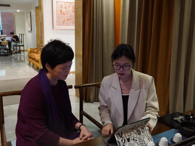 实践队成员与湖北省工艺美术大师、鄂州市雕花剪纸研究会会长、“鄂州雕花剪纸”市级非遗项目代表性传承人曹小琴老师进行深度访谈。访谈中,曹老师就鄂州雕花剪纸的发展历史和现状进行了耐心细致的阐述,并详细介绍了雕花剪纸的种类、纹样、基本技法等,为数字交互平台的设计与完善提供了宝贵的意见。