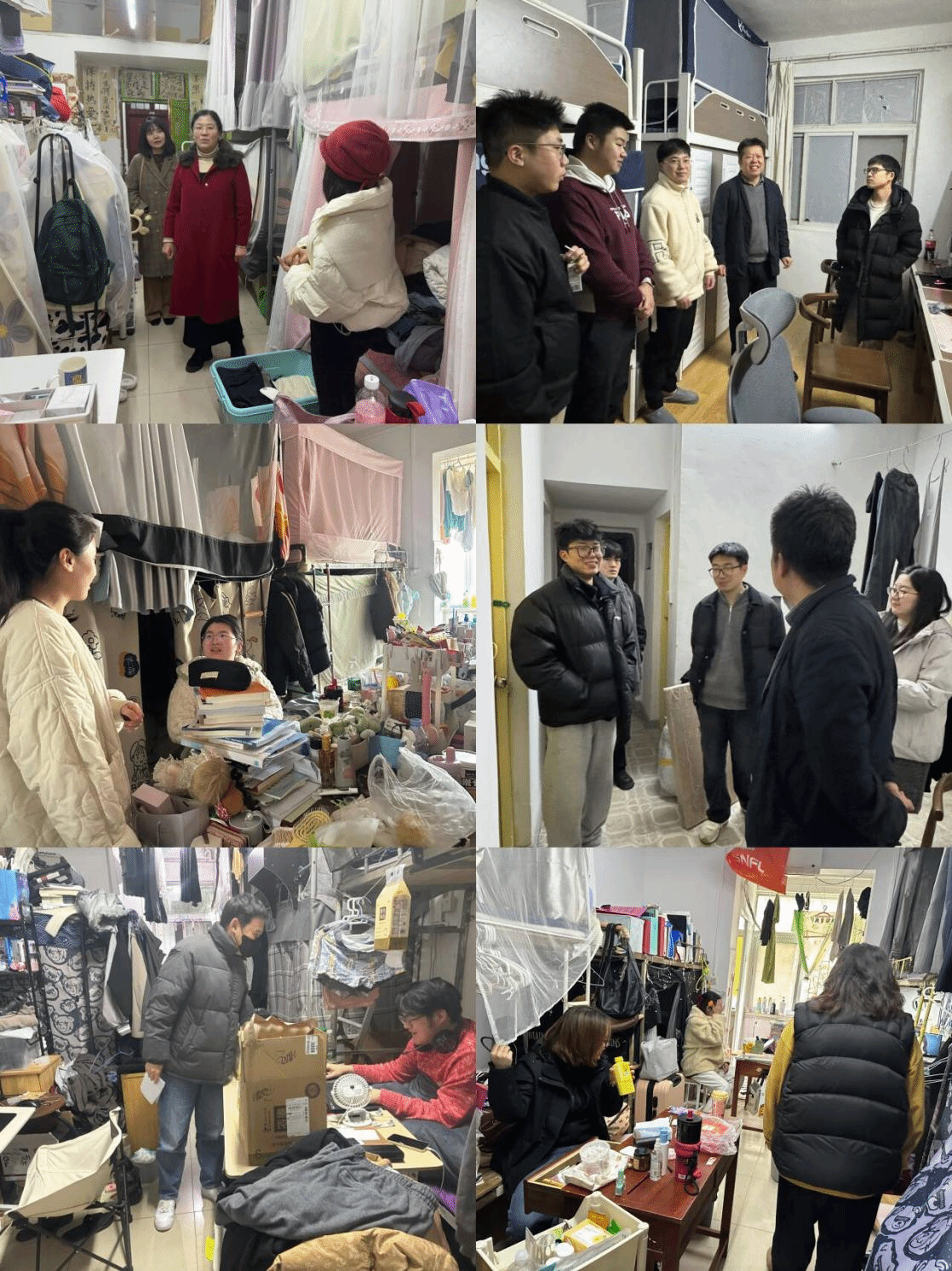 走访宿舍,关怀学子。2月16日,开学首日,学院党委书记曾令玉、院长望海军、分管教学工作副院长熊蕾、副书记刘登冉和全体辅导员老师深入本科生、研究生宿舍,走访各年级返校学生。走访过程中,老师们与返校同学聊见闻、谈学习、话成长,了解学生思想状态,指导学生新一年的学习规划,听取学生对学院教育教学和管理服务的意见建议,提醒同学们规律作息和宿舍安全注意事项。曾令玉表示:“后续学院将根据走访过程中收集到的意见,持续改进,力争为大家创造更加温馨、舒适的学习与生活环境。”