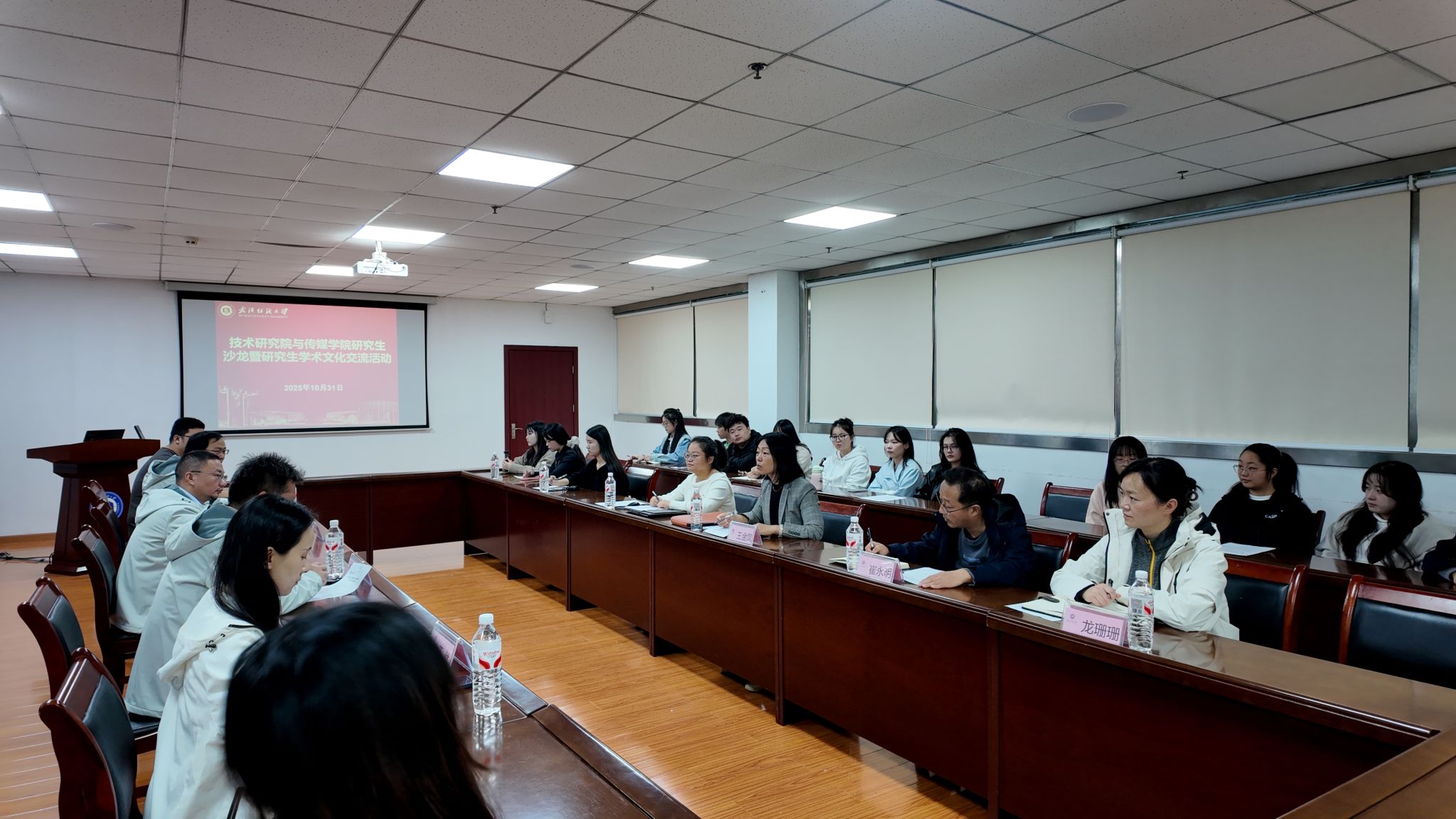 研究生交流分享环节,技术研究院研究生代表薛巧玲以 “中科院化学所交流学习”为题,分享了优秀毕业生田润昱在中科院化学所的联培收获、经验和体会,展现了跨校培养模式下的学术成长成效和研究生学术交流对科研视野拓展的积极影响。随后,同学们围绕科研锻炼与社会实践、学术成长与全面发展和工科技术拓展传媒创作方向、传媒思维优化技术产品用户体验等话题展开热烈讨论,在思想碰撞间释疑成长困惑,在话题交流中激发科研灵感。