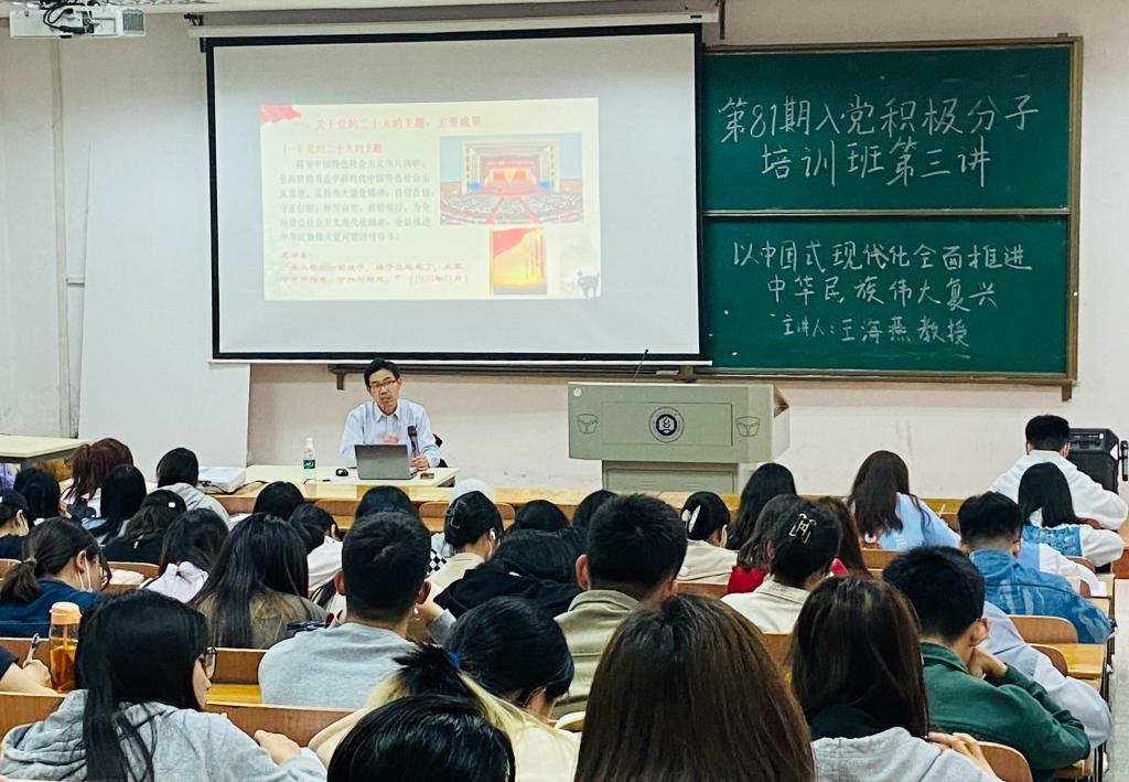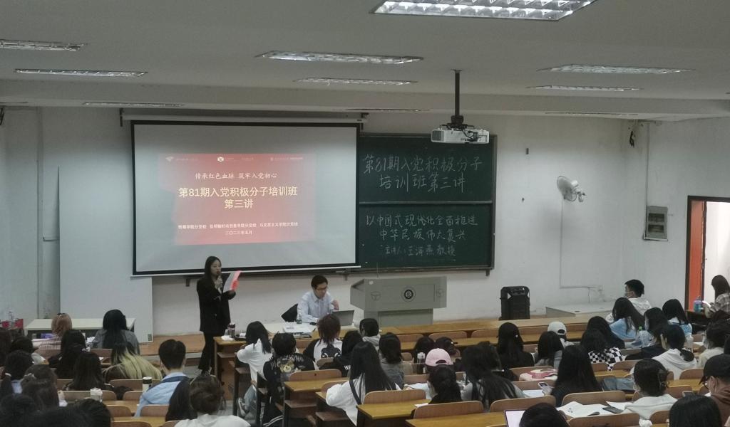 为深入学习贯彻习近平新时代中国特色社会主义思想,筑牢党性意识,5月11日,伟德国际1946bv官网、伯明翰时尚创意学院、马克思主义学院分党校第81期入党积极分子培训班第三讲在尚美楼T101开讲。马克思主义学院王海燕教授以“以中国式现代化全面推进中华民族伟大复兴”为主题,为培训班授课,南湖校区各学院二百余名入党积极分子参与本次党课学习。伟德国际1946bv官网数字媒体艺术学生党支部书记黄娅主持本次党课。