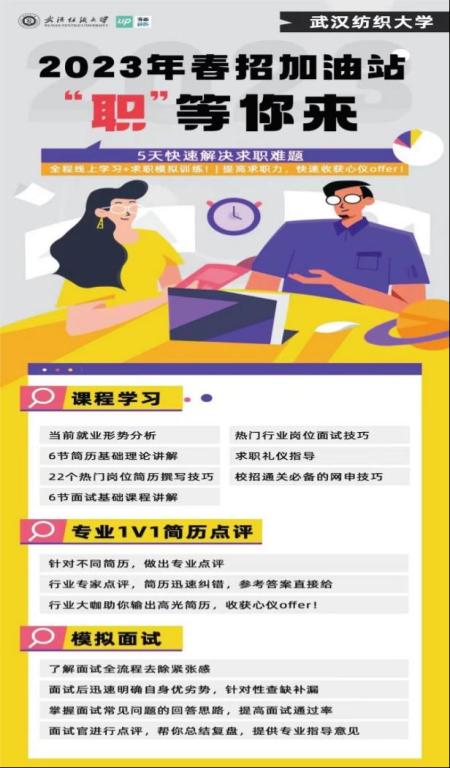 3月6日,春招加油站活动正式开营,就业形势、简历制作、面试技能、求职礼仪及网申技巧等5大模块课程,涵盖了就业形势分析、热门行业岗位面试技巧、热门岗位简历撰写技巧、面试技巧分享、求职礼仪指导、校招通关网申必备技巧、专业简历1v1点评、群面模拟、单面模拟等9项内容,同学们全方位学习了就业求职的基本要求和必备技能,进一步提升了职业认知、求职技巧和职业发展规划能力与水平。