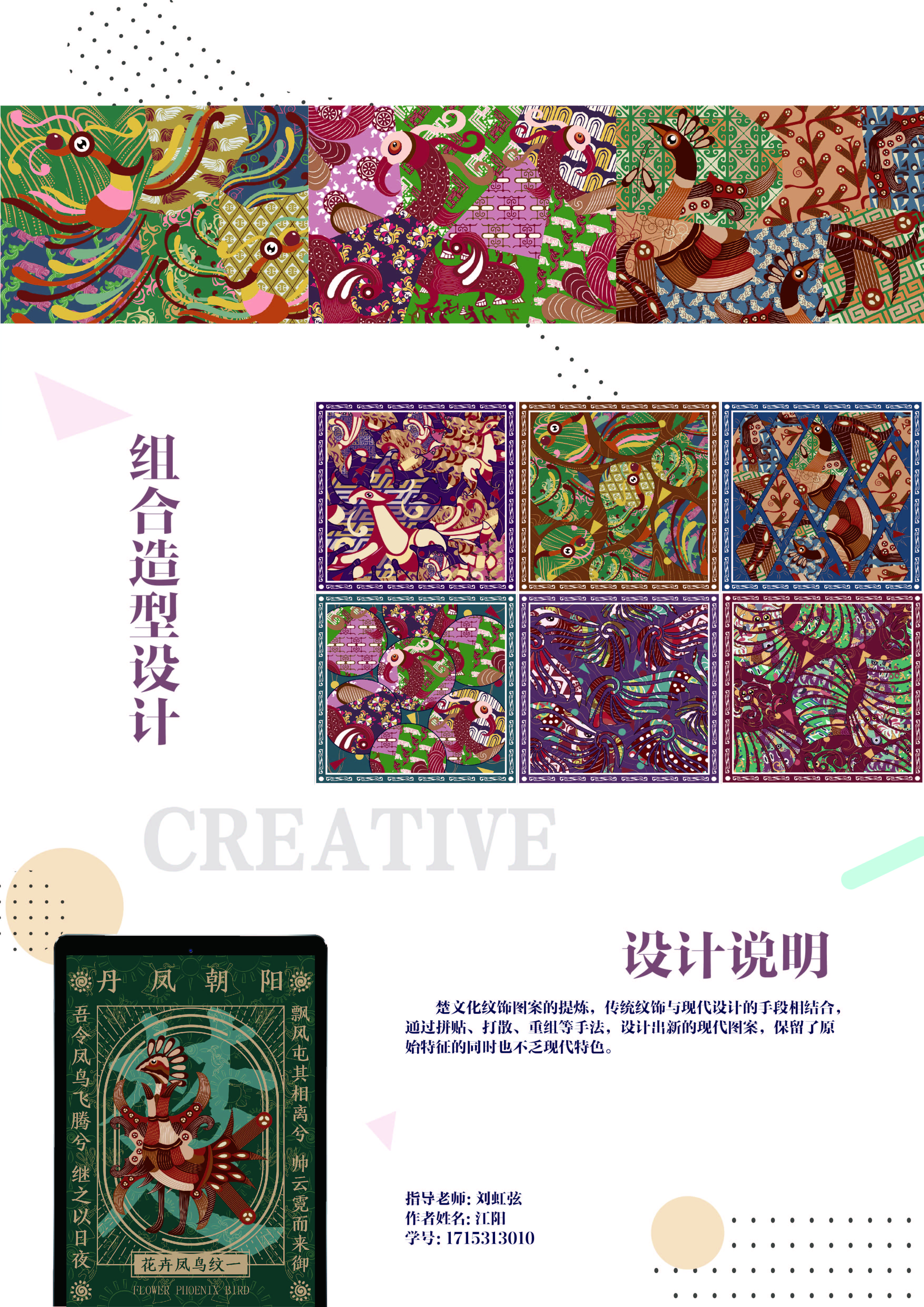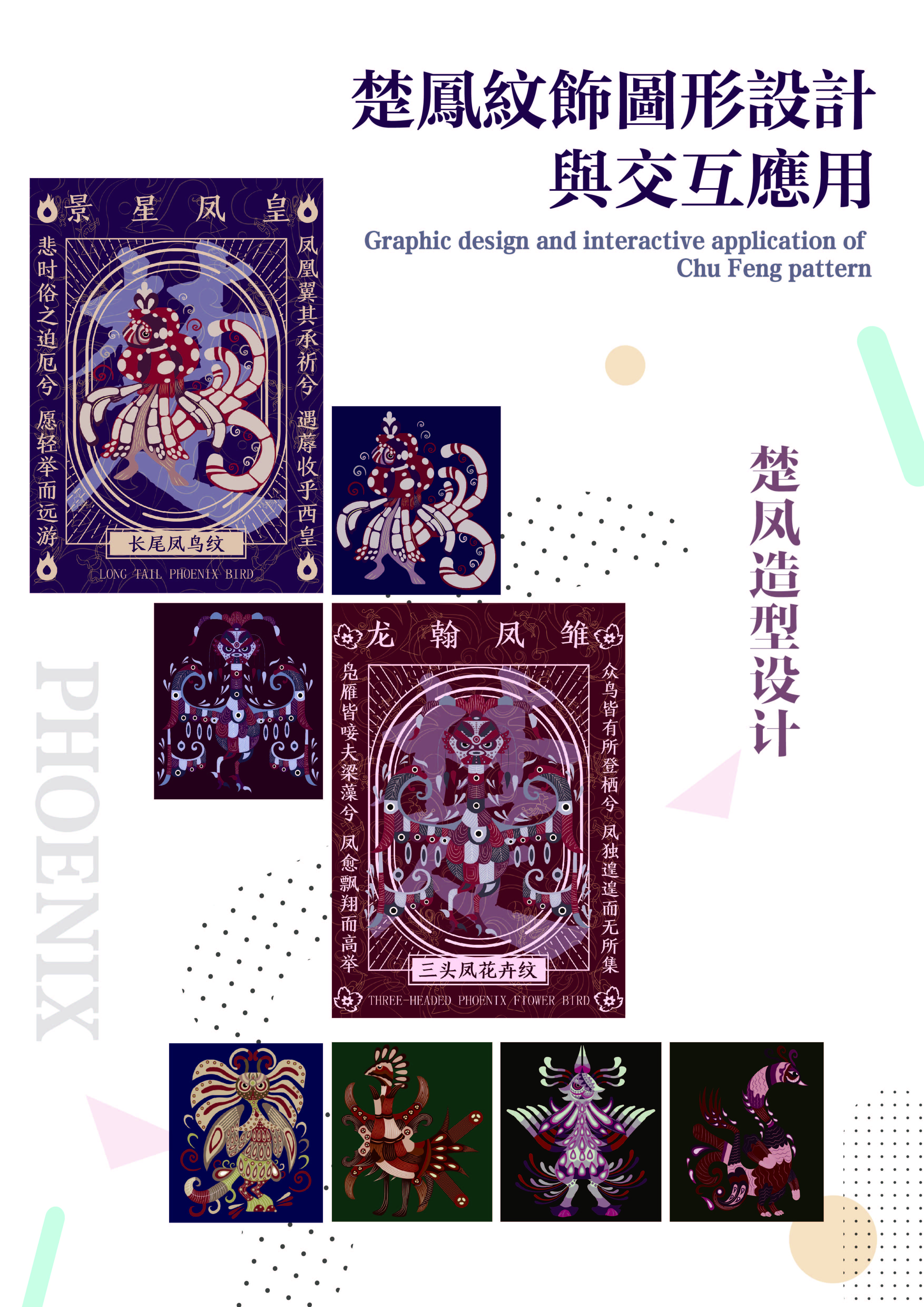 楚凤纹饰是春秋战国时期楚国的图腾,是楚人的精神文明象征,本设计采取了具有代表性的楚凤纹饰,通过对其艺术特征提取,抓住其主要特征和楚人的宗教文化,并对楚纹饰进行现代设计。楚文化纹饰图案的提炼,传统纹饰与现代设计的手段相结合,通过拼贴、打散、重组等手法,设计出新的现代图案,保留了原始特征的同时也不乏现代特色。把新的图形与屈原的诗词歌赋结合起来,增强其时代性和文化内涵,突出楚凤纹饰高洁、坚毅的品格;第二种运用打散、重构的现代设计手法,将图形进行拆分然后重组,形成似像非像的新图形;第三种运用无规则的排列方式,使图形不再那么死板,具有层次感,有大有小,有前有后,互相有对比,画面丰富的同时还具有灵感。