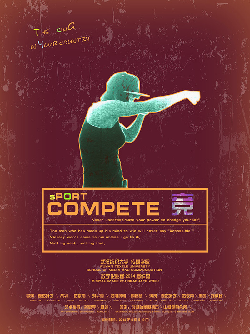 世界无时不刻都在运动着,人也一样,为了生命而竞争,为了生存而竞争。运动是最能体现竞争的表现,与时间竞争与他人拼搏。剪辑的节奏感与运动的韵律的对接,运动与竞争的关联,运动是种精神,里面蕴含着竞争的力量,人有无限潜能,竞争才能让自己激流勇进。所以本作品的主题是“竞”。 影视艺术创作主要有三个创造手段,视觉元素,听觉元素和运动元素,他们相互关联,达到对观众的感官进行艺术刺激的觉醒功能,其中运动元素主要构成就是蒙太奇和节奏,在作品“竞”中,利用蒙太奇的连续性和跳跃性结合音乐的起伏节奏,将观众的视听感官放大,感受到运动的魅力和其中的竞争精神。从汗水、肌肉、节奏来认识运动,感受竞争。
