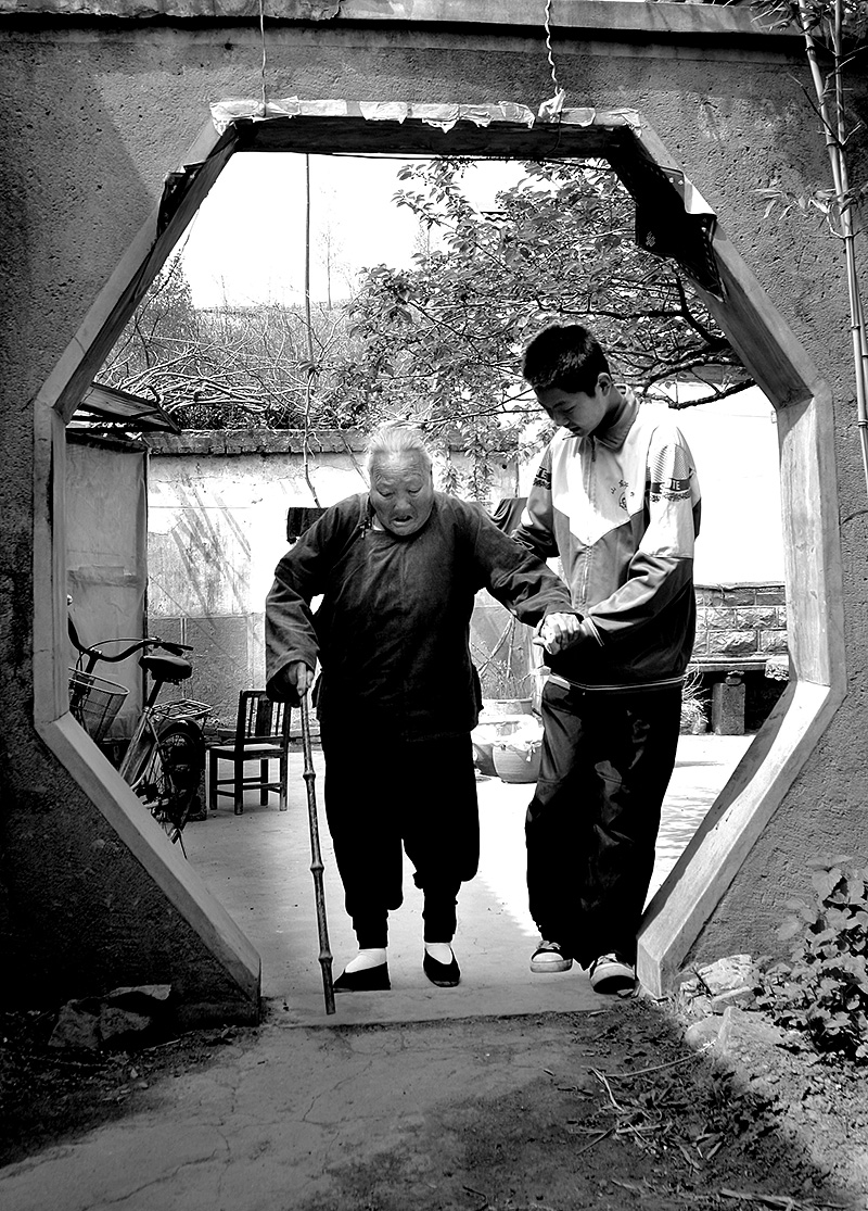 刘勤叶”,90岁,10岁时缠足,15岁时出嫁。缠足已经到现在为止已有80年了,在解放后由于当时缠足的厉害也没有放开。在那个特殊的审美标准的年代里,天生丽质又缠得一双好脚的无疑是个标准的美人,但命运却偏偏给她带来了额外的负担。15年前丈夫去世,儿女也都搬到外地去了,一年回来看她一次,所以只能自己一个人独守着自己深爱的、用一生的奋斗换来的家产——老屋。