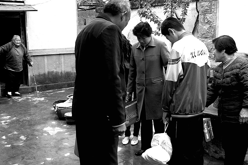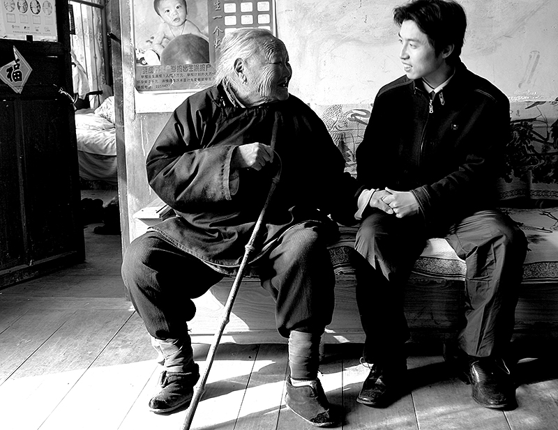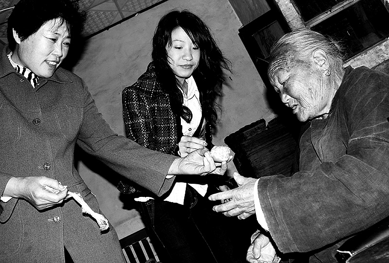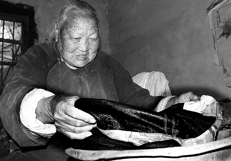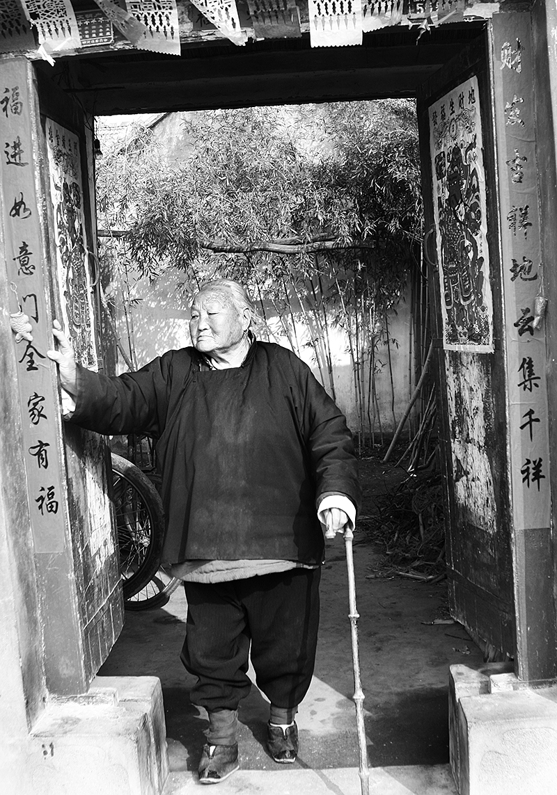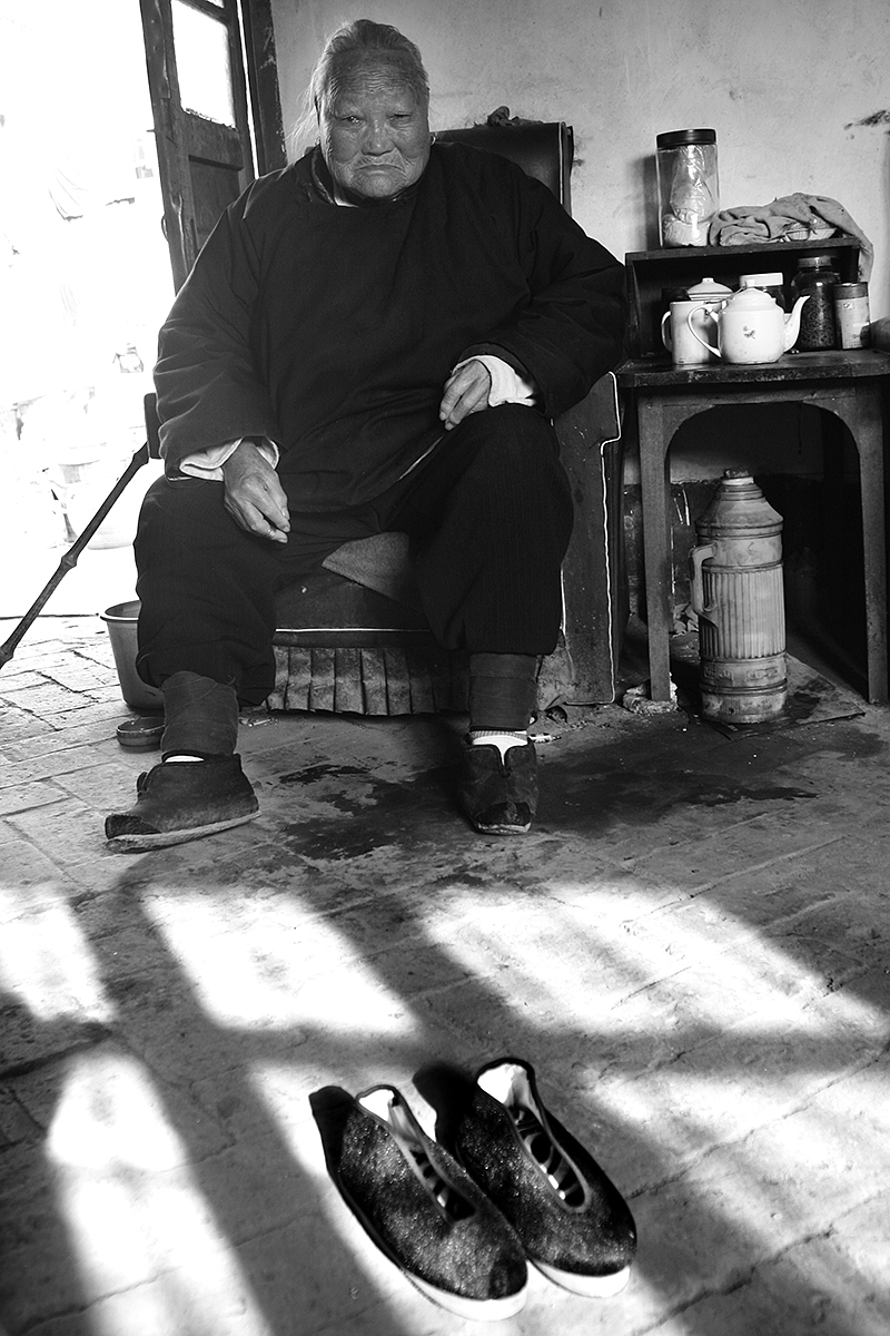 张道英,81岁,9岁时就裹脚,17岁出嫁。在那个特殊的年代里张道英说:小姑娘都要裹脚,不裹的话就嫁不出去,邻居也会说闲话的。再那个封建社会里这是没办法的事只有服从的份。出嫁时也不知道自己的新郎官是什么样子,洞房花烛夜当新郎官掀起自己的盖头时才知道自己的丈夫原来是一个瘸子。日子就这样过着,虽然自己并不情愿嫁给这样的人,可在那时侯是没办法的事。一年后她的娃子永顺来到了这个世界,无疑这给张道英带来了无限的希望。几乎每个集市张道英都会用她的小脚走到15里地的集市去,卖掉她平时在家织的布换点小钱,补贴家用。就这样他的二儿`三姑娘`小女儿相继出生了。。丈夫与7年前离开了人世,因为大儿子在本村是位老师,所以和张道英一直住在农村 。让张道英安慰的是儿媳妇孝顺,从不难为自己。儿女们也知道老人一辈子不容易,虽住城里可每个月都回去看望老人家。