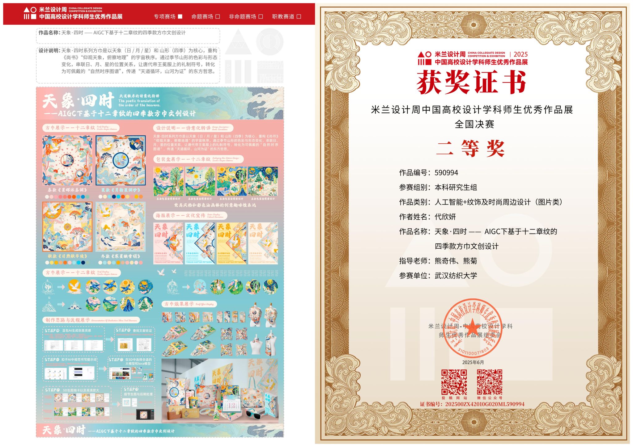 7月9日,第九届米兰设计周-中国高校设计学科师生优秀作品展“‘人工智能+纹饰及时尚周边设计’课赛结合邀请赛”在浙江理工大学圆满落幕,伟德国际1946bv官网代欣妍、邹宜恬两位同学凭借扎实的专业素养和创新设计能力,从众多参赛高校学子中脱颖而出,双双荣获全国决赛二等奖,代欣妍作为青年学生设计代表,受邀赴杭州阿里巴巴全球总部参与D20全球设计院长峰会并登台领奖,充分展现了伟德国际1946bv官网在数智时尚设计及AI赋能人才培养方面的显著成效。