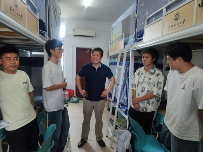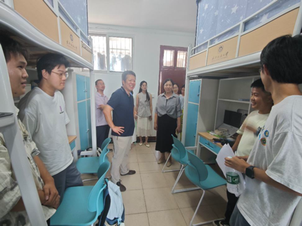 每走进一间宿舍,曾令玉、望海军向新生表示热烈欢迎,并与新生亲切交谈,聊家乡风景美食、聊兴趣聊爱好,迅速拉近心灵的距离。交流中,曾令玉、望海军勉励同学们珍惜大学时光,既要扎实学好专业知识,提升专业能力,也要积极投身社会实践,全面提升综合能力,为未来发展打牢基础。班主任(德育导师)也结合自身经历,为新生详细解答课程安排、学习方法、学科竞赛、社团活动、校园生活等方面的疑问,细致入微的关怀让初来乍到的同学们倍感安心。