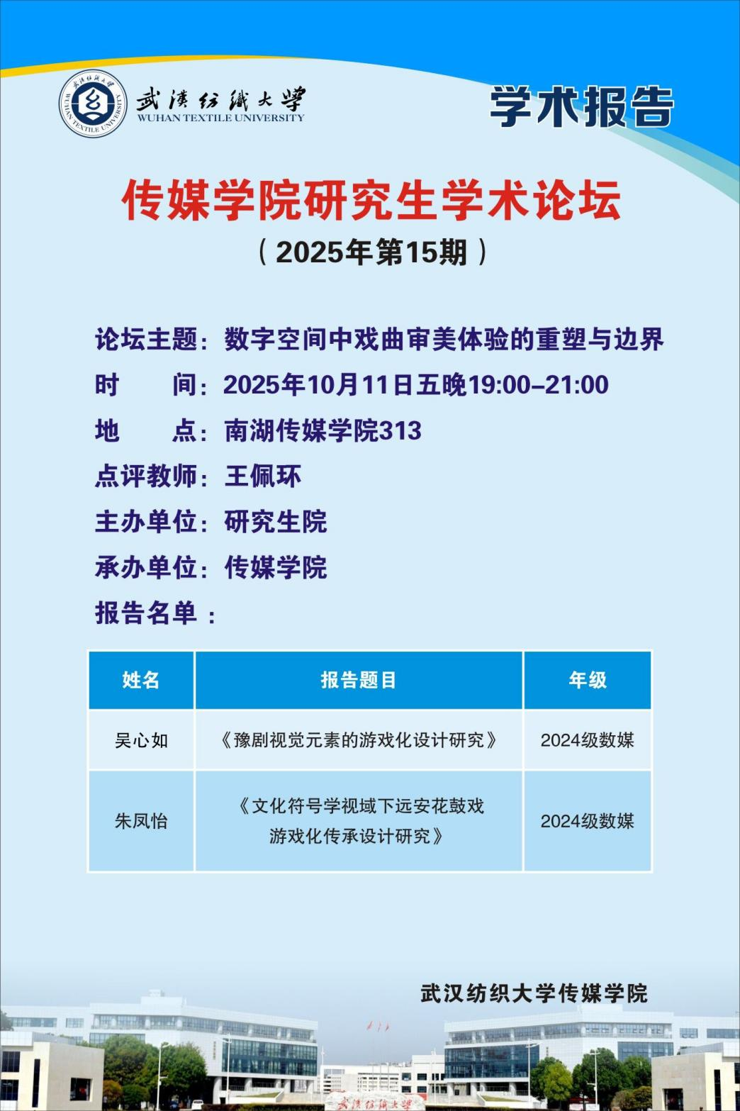 2025年10月11日19时,伟德国际1946bv官网在西配楼S313室举办第15期研究生学术论坛。本次论坛以数字空间中戏曲审美体验的重塑与边界为主题,2024级设计专业研究生吴心如、朱凤怡依次进行汇报分享,论坛由王佩环老师点评分析。