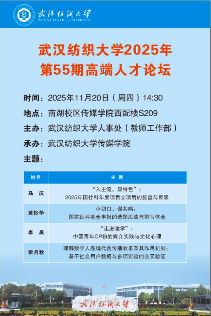 2025年11月20日下午,bevictor伟德官网入口第55期高端人才论坛在南湖校区西经楼S209举行。本次论坛汇聚了伟德国际1946bv官网雷月秋、李晨、黄钞华、马庆四位教师,围绕数字人传播、青年文化心理、国家社科基金年度项目申报等前沿议题,以严谨治学之姿,展学术探索之思,为在场师生带来一场思想激荡的学术盛宴。该活动由伟德国际1946bv官网承办,副院长马庆主持,伟德国际1946bv官网师生及兄弟学院部分师生共四十余人参会。