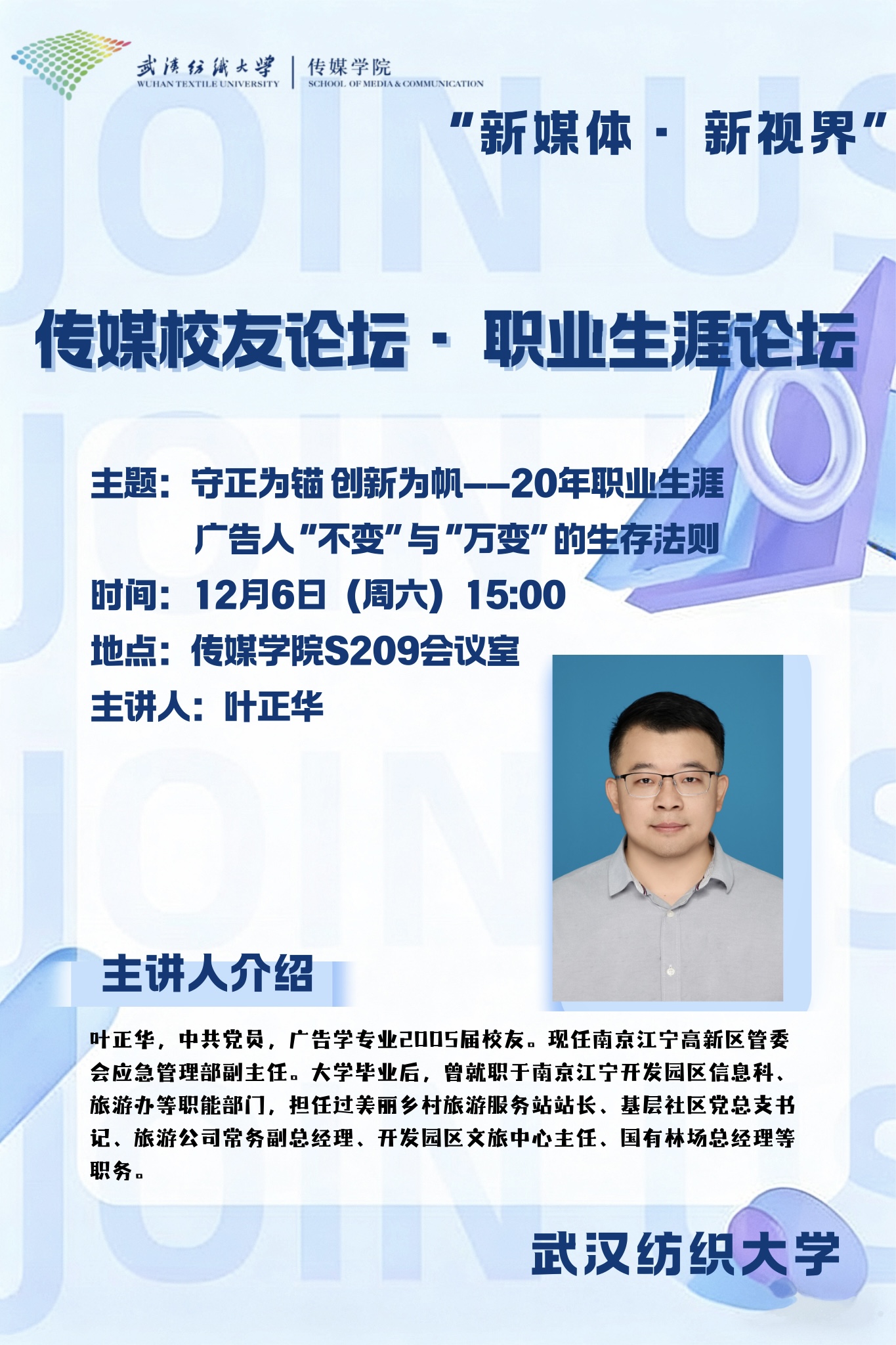 论坛中,现任南京江宁高新区管委会应急管理部副主任的叶正华校友,以“守正为锚,创新为帆——20年职业生涯中广告人‘不变’与‘万变’的生存法则”为题作主题报告。他以自身二十载职业历程为脉络,结合国家“十一五”到“十四五”的规划发展,系统梳理了中国传媒广告行业不同阶段的核心命题与应变智慧。叶正华强调,“守正” 是广告人安身立命之本,需始终恪守正确导向、社会责任与专业伦理;“创新” 是行业发展之帆,要主动拥抱技术变革、整合多元平台、引领价值传播。他还结合自身从基层宣传、旅游开发、社区治理到应急管理的跨界实践,生动诠释了广告思维在品牌塑造、文化策划与公共传播领域的创新应用,为学子解读如何以不变初心应对万变时代浪潮。