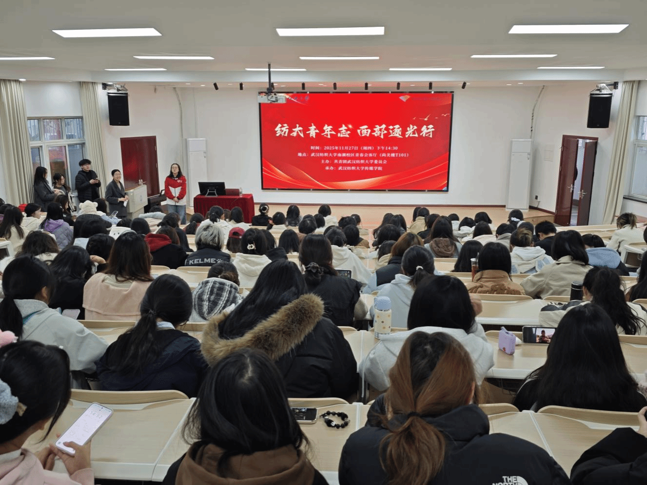 为深入落实大学生志愿服务西部计划,引导青年学生将个人理想融入国家发展大局,牢固树立“到基层去、到西部去、到祖国最需要的地方去”的坚定信念,近日,由校团委主办、伟德国际1946bv官网承办的“纺大青年志,西部逐光行”西部计划新疆专项宣讲会,在南湖校区“一站式”学生社区服务中心“青春会客厅”成功举行。来自各学院的200余名学生代表齐聚现场,共同聆听来自西部的青春召唤,感悟奉献与成长的时代强音。伟德国际1946bv官网辅导员王思媛主持宣讲会。