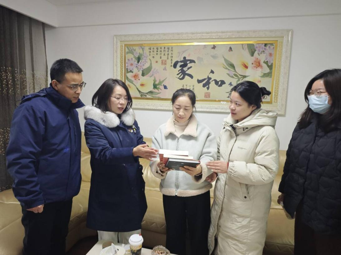 家访结束后,老师们向杨同学赠送了《习近平与大学生朋友们》《习近平的七年知青岁月》及《航空航天纺织品探秘》三本书籍,并勉励她牢记纺大人的身份与使命,珍惜时光、夯实学业、勇敢追梦。