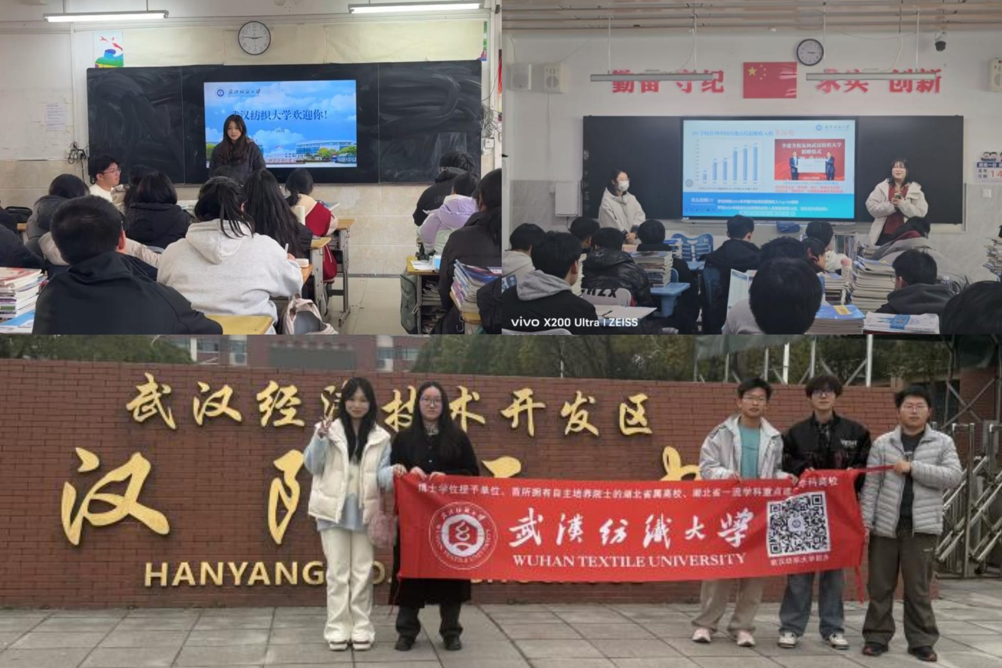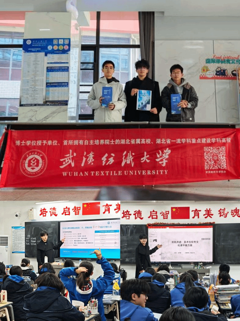 容宇琪团队进入武汉育才美术高中宣讲,重点解读学校学科发展情况、保研资格等核心优势,分享高考备考经验并组建“纺美同源护航备考营”QQ群,持续推送300-400份备考资料与招生资讯;卢慧团队进入武汉市关山中学宣讲,详细解读投档分数线与专业分数要求,结合自身经历拆解志愿填报技巧;高婉瑜团队进入武汉长虹中学宣讲,融合校史底蕴与王牌专业特色宣讲,发放定制纪念品并搭建线上咨询群;刘照晗团队进入经开汉阳三中宣讲,针对宣讲前发放的调查问卷针对性地开展答疑解惑,为学弟学妹明晰升学方向。