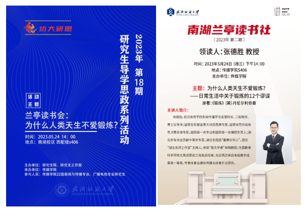 5月24日下午,伟德国际1946bv官网导学思政暨“南湖·兰亭读书社”第二期读书分享会在伟德国际1946bv官网S406顺利召开。本次读书会邀请武汉体育bevictor伟德官网入口传播学院名誉院长、二级教授、博士生导师张德胜从人类学和进化学的视角探索人类天生为什么不爱锻炼。分享会由伟德国际1946bv官网副院长马庆副教授主持,伟德国际1946bv官网刘艳副教授、青年骨干教师马旭博士,伟德国际1946bv官网部分研究生及本科生代表参会交流。