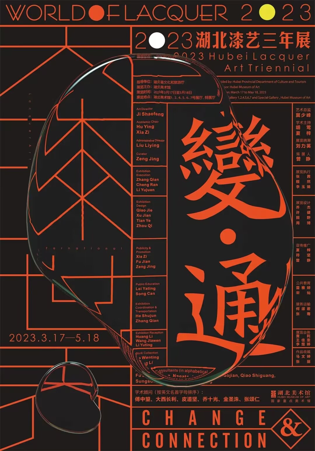 “大漆世界:变·通——2023湖北漆艺三年展”由湖北省文化和旅游厅担任指导单位,湖北美术馆主办,于2023年3月17日至5月18日在湖北美术馆展出。本次展览有来自中国、日本、韩国、美国、法国、西班牙、越南、泰国、缅甸9个国家的147位艺术家200余组漆艺作品,包括漆画、漆器及装置、数字作品等。