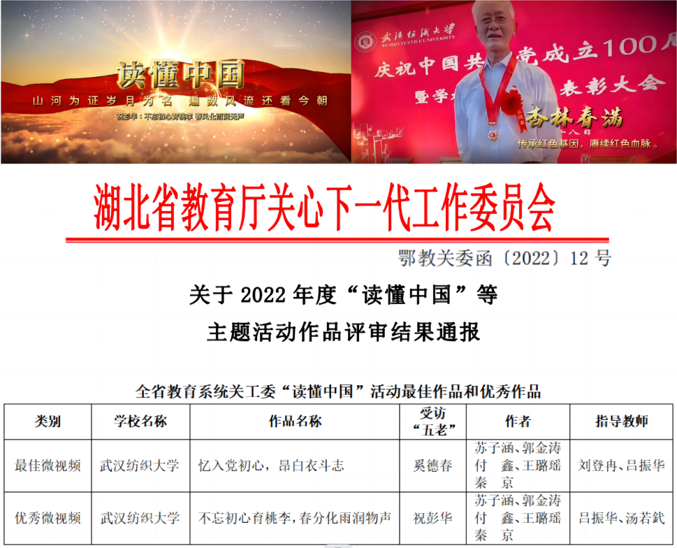 近日,湖北省教育厅关工委2022年度“读懂中国”等主题活动作品评审结果公布,伟德国际1946bv官网“四力”实践团创作的《忆入党初心,昂白衣斗志》和《不忘初心育桃李,春风化雨润无声》两部作品分别获最佳微视频和优秀微视频奖项。