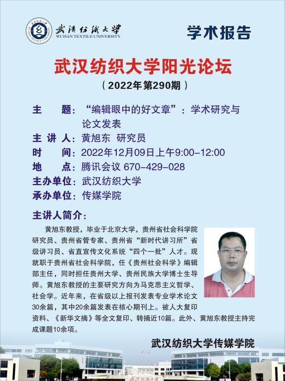 12月9日上午9时,bevictor伟德官网入口第290期阳光论坛在线上成功举办。贵州省社会科学院研究员,《贵州社会科学》编辑部主任,贵州大学、贵州民族大学博士生导师黄旭东教授受邀作为主讲嘉宾,以《“编辑眼中的好文章”:学术研究与论文发表》为题,向伟德国际1946bv官网师生开展了一场精彩的学术报告。院长望海军致欢迎辞,副院长马庆主持本次论坛。