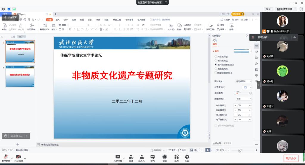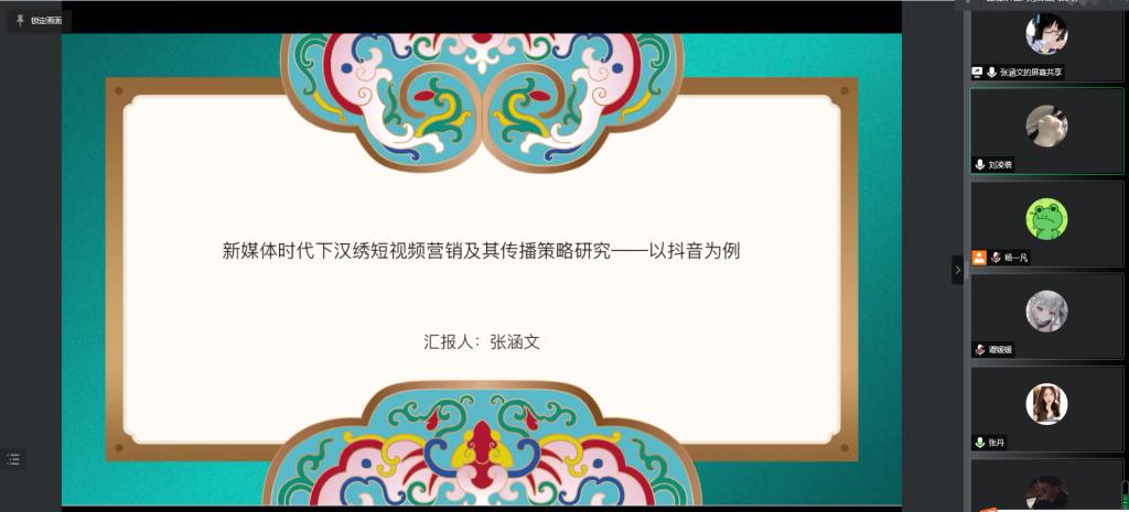 首先,参会研究生汇报以非物质文化遗产为专题的研究问题、研究进展及分享研究成果。汇报完毕后,由研究生导师张丹依次对应完成研究进度推进、研究成果点评、研究问题答疑。