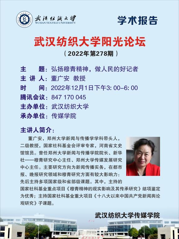 12月1日下午3时,bevictor伟德官网入口第278期阳光论坛暨“传播·视觉影响力”学术季第24期论坛在线上成功举办。郑州大学新闻与传播学学科带头人、原穆青研究中心主任董广安教授受邀作为此次论坛的主讲嘉宾,向伟德国际1946bv官网师生开展了一场以“弘扬穆青精神,做人民的好记者”为主题的学术报告。马庆副院长主持了本次论坛。