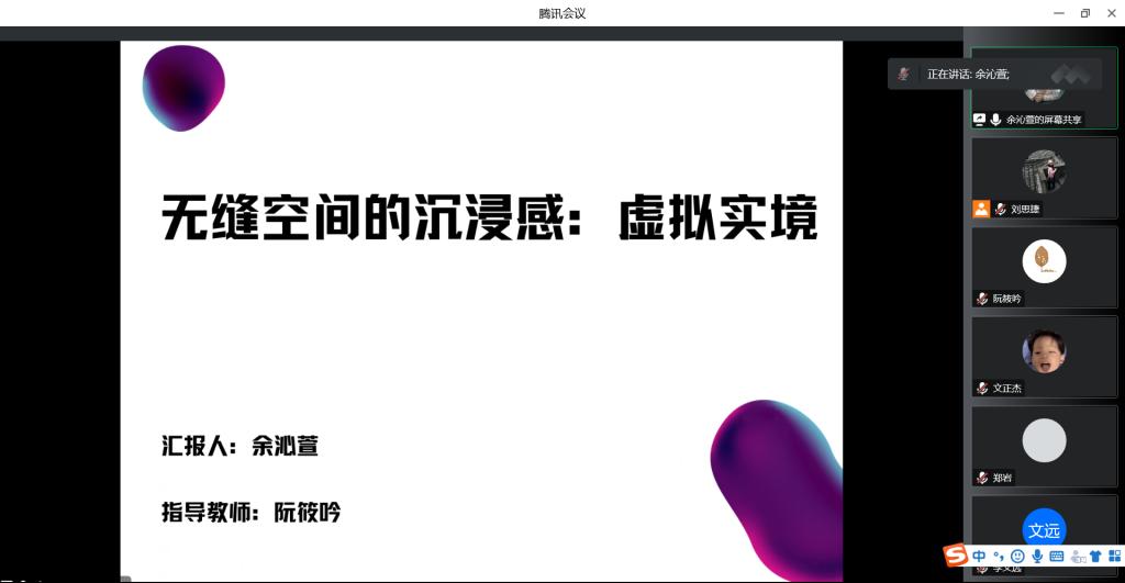 余沁萱同学分享的主题是《无缝空间的沉浸感:虚拟实境》,具体探讨了虚拟现实的历史发展过程、应用层面以及未来发展的趋势,详细说明了沉浸感作为虚拟现实中最重要的一个因素,以及虚拟现实中内容互动的重要性。对于未来而言,虚拟现实可以被有效利用,以发挥其自身的价值。