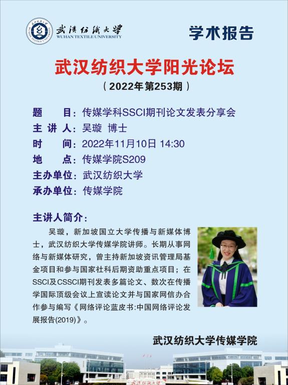 11月10日下午3时,伟德国际1946bv官网在南湖校区西配楼S209室举办“传媒学科SSCI期刊论文发表分享会”,新加坡国立大学传播与新媒体博士、伟德国际1946bv官网新进青年教师吴璇担任主讲人。在会上,吴璇博士就关注SSCI期刊的必要性,如何选择适合自己科研方向的SSCI期刊论文并投递,SSCI期刊论文的基本要求、写作规范及审稿流程几个方面展开讲座,为研究学者们提供SSCI期刊论文发表的国际视野,拓宽论文发表渠道。
