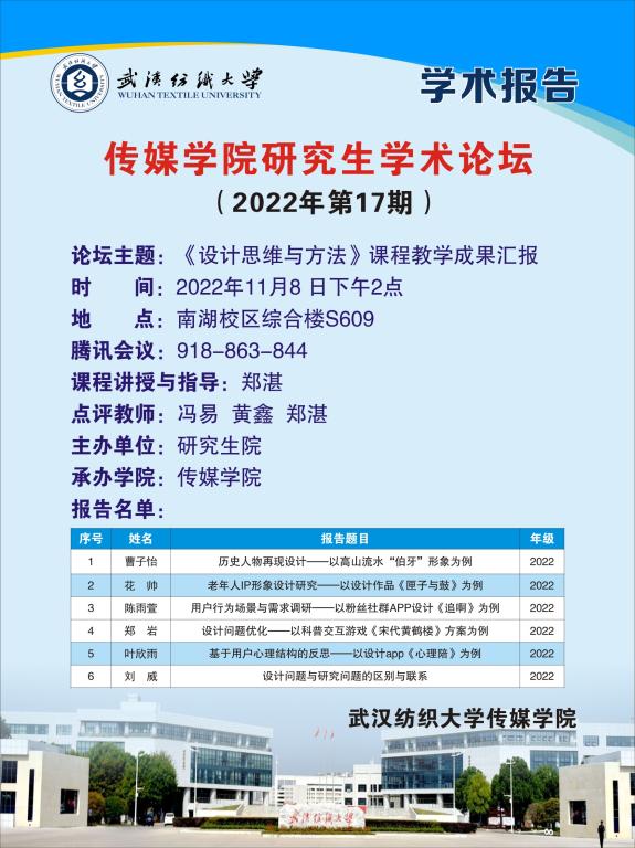 11月8日下午,伟德国际1946bv官网举办2022年第17期研究生论坛。本次论坛主题就《设计思维与方法》课程进行教学成果汇报。6名修完课程的研究生分享了各自的分析调研过程、设计方案艺术化呈现、优化产品功能模块等学术经验。论坛采取线上线下同步的方式进行,该课程授课老师郑湛副教授主持论坛并点评指导。广告系主任冯易副教授、网络与新媒体系黄鑫副教授受邀参与点评,部分伟德国际1946bv官网研究生赶至论坛现场聆听。