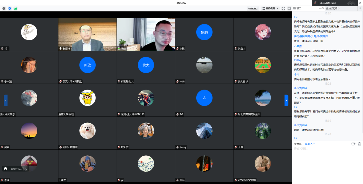 讲座结束后,马庆副院长对讲座内容进行梳理总结,与会师生们进行现场提问。赵振祥教授对大家提出的“如何定义国家文化形象传播的生命周期”“时尚与出版业的关系”以及“如何研究奥运中的时尚传播领域”等问题进行了详细解答。会议在热烈的学术讨论中圆满结束。