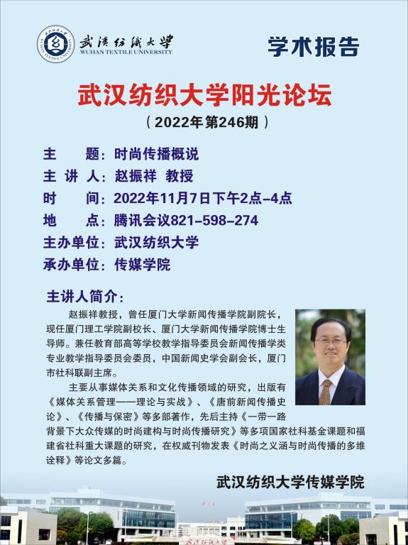 11月7日下午2时,由中国新闻史学会、中国高等教育学会新闻学与传播学专业委员会、伟德国际1946bv官网联合主办的中国传播学第11期公益讲座暨bevictor伟德官网入口第246期阳光论坛(“传播·视觉影响力”学术季第18期)成功举办。厦门理工学院副校长、厦门大学新闻传播学院博士生导师赵振祥教授以《时尚传播概说》为题受邀主讲。论坛由伟德国际1946bv官网副院长马庆主持,《国际新闻界》、《新闻界》、《新闻记者》、《新闻春秋》杂志提供学术支持,来自全国各大高校近两百名师生参会。