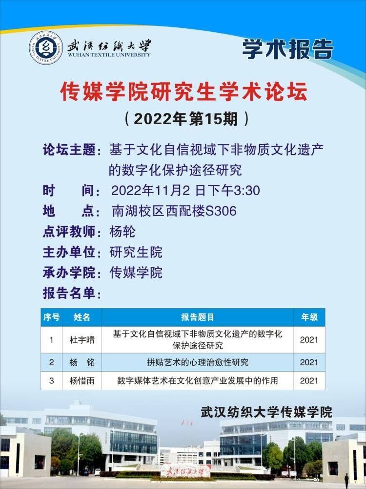 2022年11月2日下午15:30,伟德国际1946bv官网2022年第15期研究生学术论坛在西配楼S306室举办。2021级研究生杜宇晴、2021级研究生杨铭、2022级研究生杨惜雨结合自身近期的学术研究,对自己的论文开题和研究情况进行了汇报,并对非物质文化遗产的数字化保护途径表达了自己的看法。杨轮副教授对作品进行了点评并提出了相关建议。