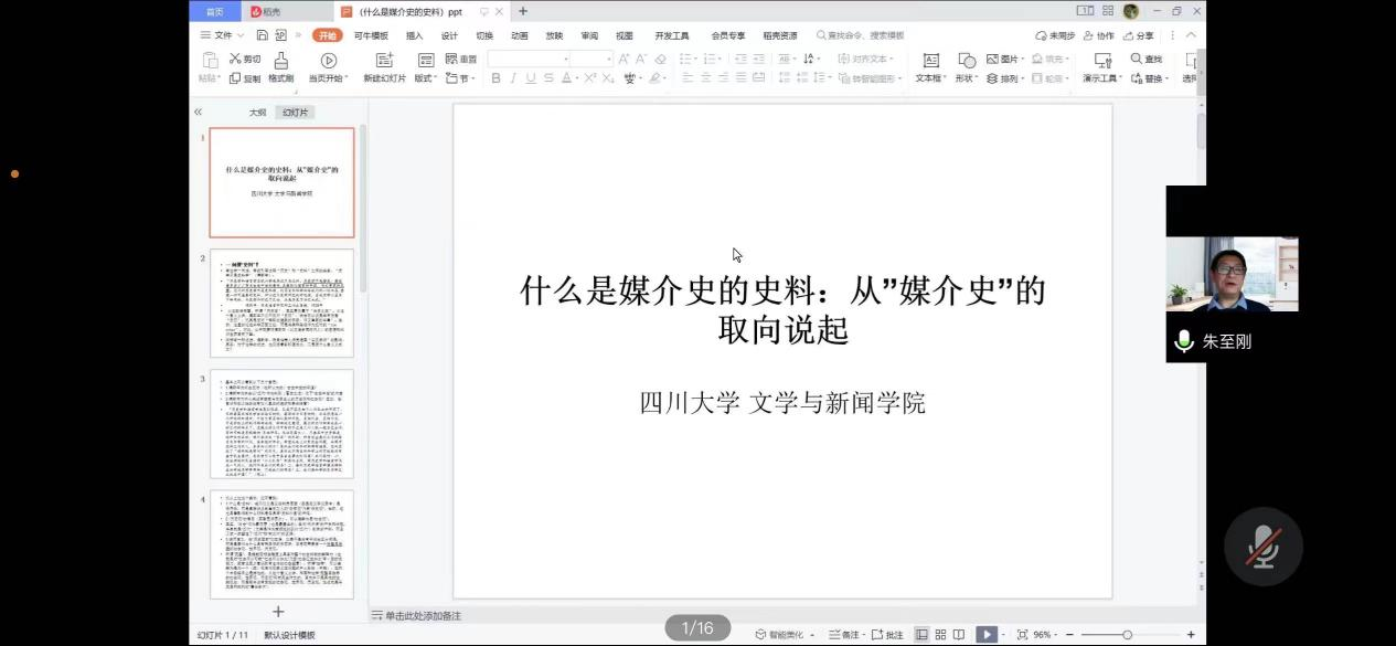 讲座中,朱至刚教授从“何谓史料”、“什么是媒介史”、“如何去理解‘媒介史’的史料”三个问题出发,引领师生们思考媒介史、传播史、新闻史三者之间的关系。朱至刚教授用一个又一个生动、通俗的案例帮助师生们理解史料和史观的内涵,带领师生们真正走进媒介史,从新视角解读媒介史。他强调:“要以‘媒介’为中轴,以观察和理解历史为目的,去理解媒介史。”“观察和理解历史,不能回避方法论,要有清晰的方法论。”整场会议下来,朱至刚教授凭借渊博的学识和幽默的话语,用讲故事的方式赋予媒介史新的活力,让学术性和通俗性真正融为一体。
