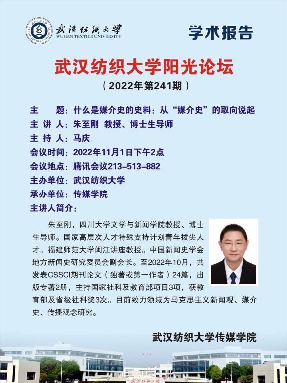 11月1日下午2时,bevictor伟德官网入口第241期阳光论坛暨伟德国际1946bv官网“传播·视觉影响力”学术季第17期在线上如期举行。本次论坛由伟德国际1946bv官网承办,邀请四川大学文学与新闻学院博士生导师朱至刚教授作为主讲嘉宾,以《什么是媒介史的史料:从“媒介史”的取向说起》为题,向近两百名参会师生呈现了一场精彩绝伦的学术盛宴。伟德国际1946bv官网副院长马庆主持了本次论坛。