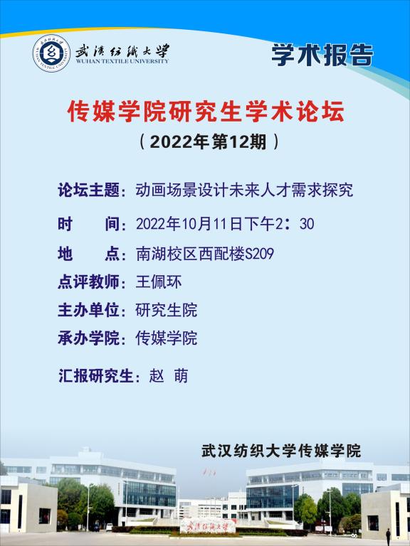 2022年10月11日下午2:30,伟德国际1946bv官网研究生第12期知行论坛在南湖校区西配楼S209举行。研究生赵萌同学以《动画场景设计未来人才需求探究》为主题进行汇报,王佩环副教授点评,伟德国际1946bv官网部分研究生积极参加了此次活动。