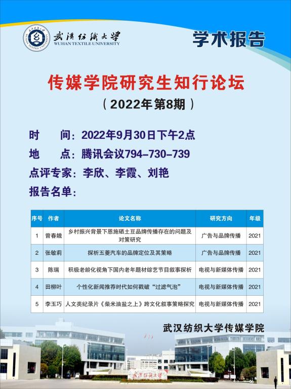 本次论坛分两部分展开。新闻与传播专业研究生曾春娥、张敏莉从广告与品牌传播角度分别就《乡村振兴背景下恩施硒土豆品牌传播存在问题及对策》、《探析五菱汽车的品牌定位及其策略》进行汇报讲解;陈瑞、田柳叶和李玉巧则以电视与新媒体的视角分别从《积极老龄化视角下国内老年题材综艺节目叙事探析》、《个性化新闻推荐时代如何戳破“过滤气泡”》及《人文类纪录片<柴米油盐之上>跨文化叙事策略探究》三个主题进行探讨。汇报期间,三位副教授对每个报告做出专业点评,针对出现的问题给予中肯建议和指导,线上会议学术氛围浓厚。