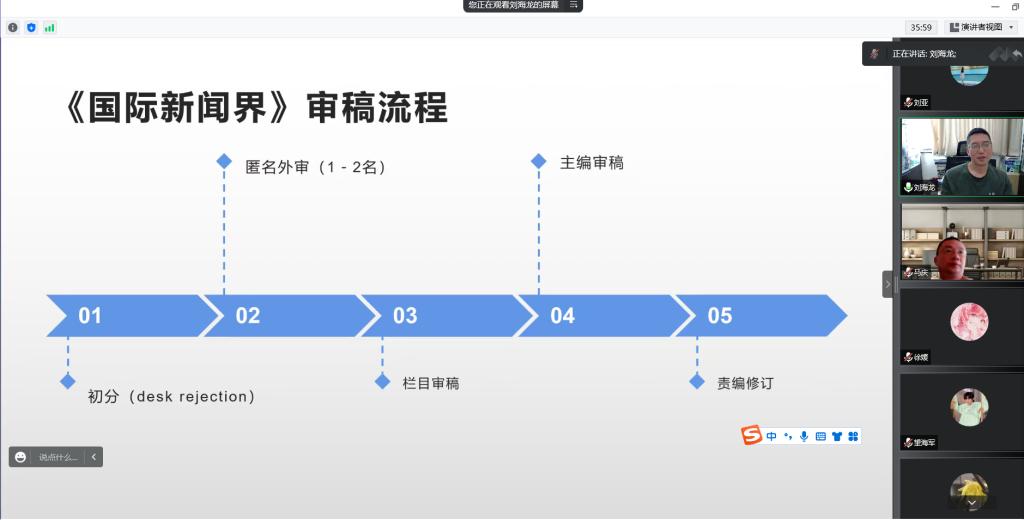 随后,刘海龙教授现场介绍了《国际新闻界》审稿流程。首先是初分,也是筛选选题的过程。然后是审稿,其中包括匿名外审、栏目审稿、主编审稿三步,匿名外审是根据文章内容将其分给不同领域专家审阅;栏目审稿是对文章进行整体把关;主编审稿是最终决策。最后是责编修订,即在格式、行文规范上进行调整。整个流程下来,短则半年,长则一年多,因此要有足够的耐心。